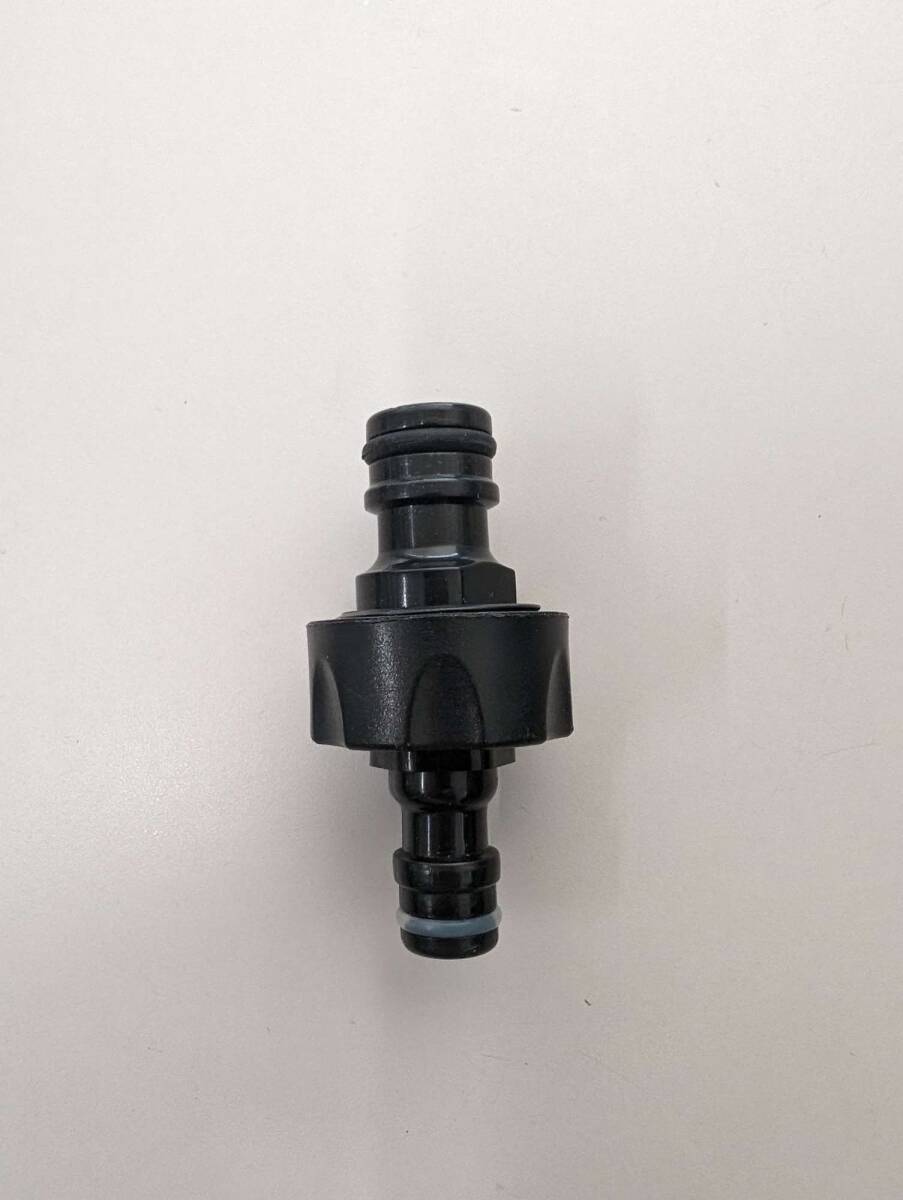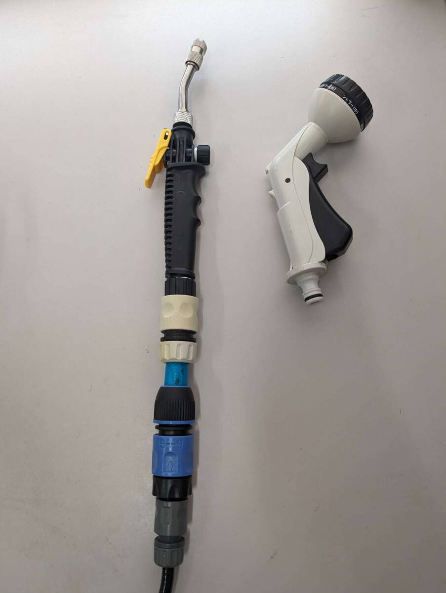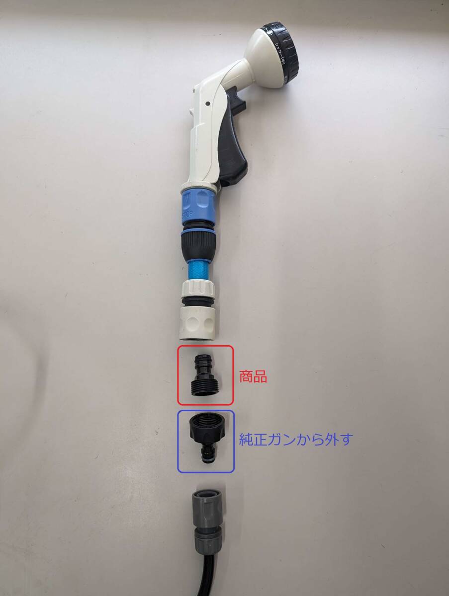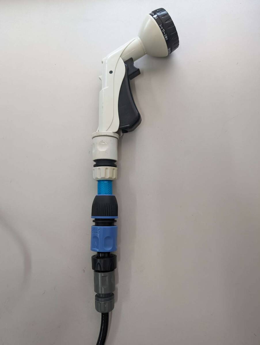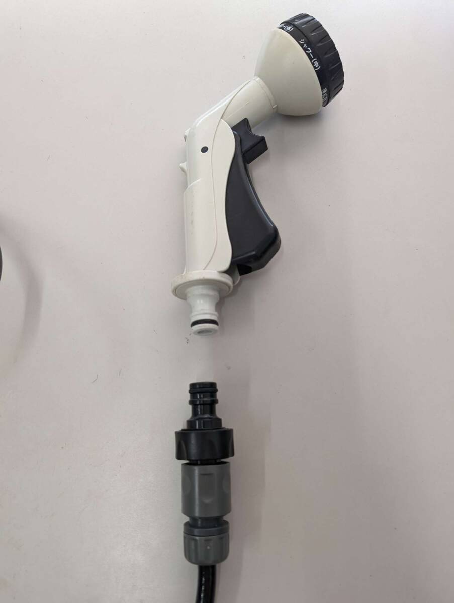 画像6の部品が販売品です。PLW-150では細径ジョイントですが、この部品を介することで通常のジョイントサイズになります。そのため通常入手できる散水ガンやシャワーヘッドが使えます。