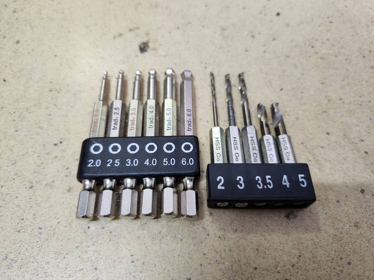 サイズは六角レンチが2.2、5.3.4.5.6の6本セットでドリルの刄は2.3.3、5.4.5の5本セットです。