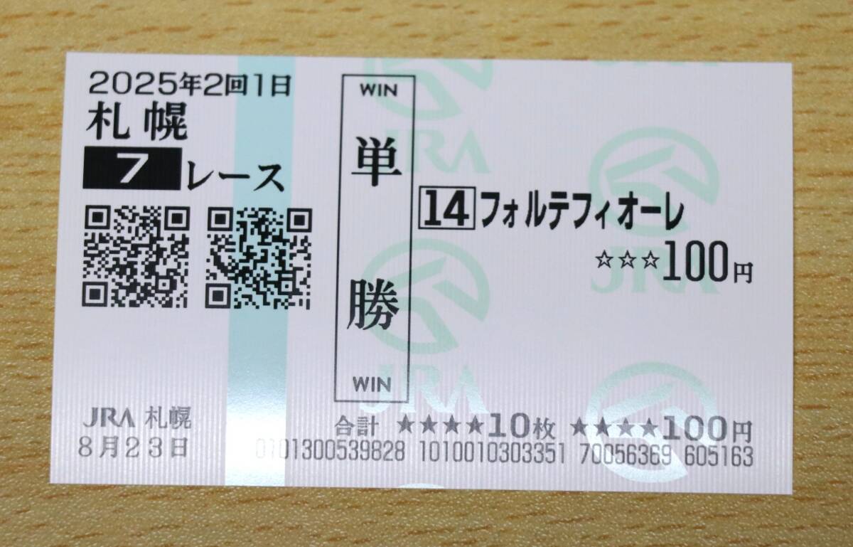 フォルテフィオーレ 札幌 7R (2025年8/23) 現地単勝馬券(札幌競馬場)です。気に入って頂けた方の落札を心よりお待ちしております。 商品は定型郵便(110円)又は又はゆうパケットポストminiで発送となります。 厚さの関係上、定型郵便の場合は片面段ボール補強、ゆうパケットポストの場合は両面段ボール補強となります。どうかよろしくお願い致します。