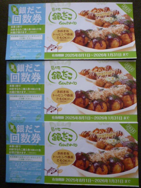 3枚 築地 銀だこ 2026年1月31日 引換券 回数券 たこ焼き 銀たこ GINDAKO