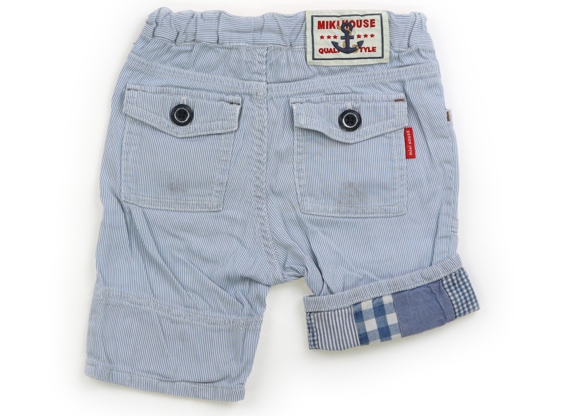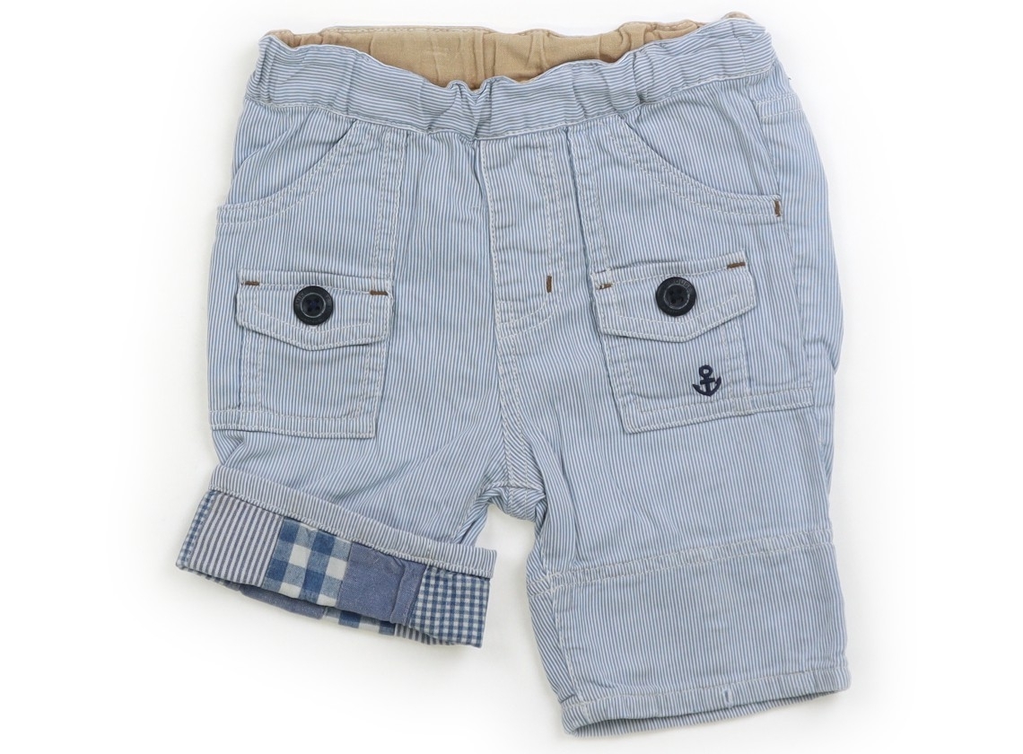 コットン布帛地。すそを折り返して2wayでご使用いただけます。サイズ調整ゴムが付いています。ウエストゴムがねじれています。お尻には土汚れの跡と黄色いシミがあります。たくさん必要なベビーサイズ、洗い替え用にいかがでしょうか?