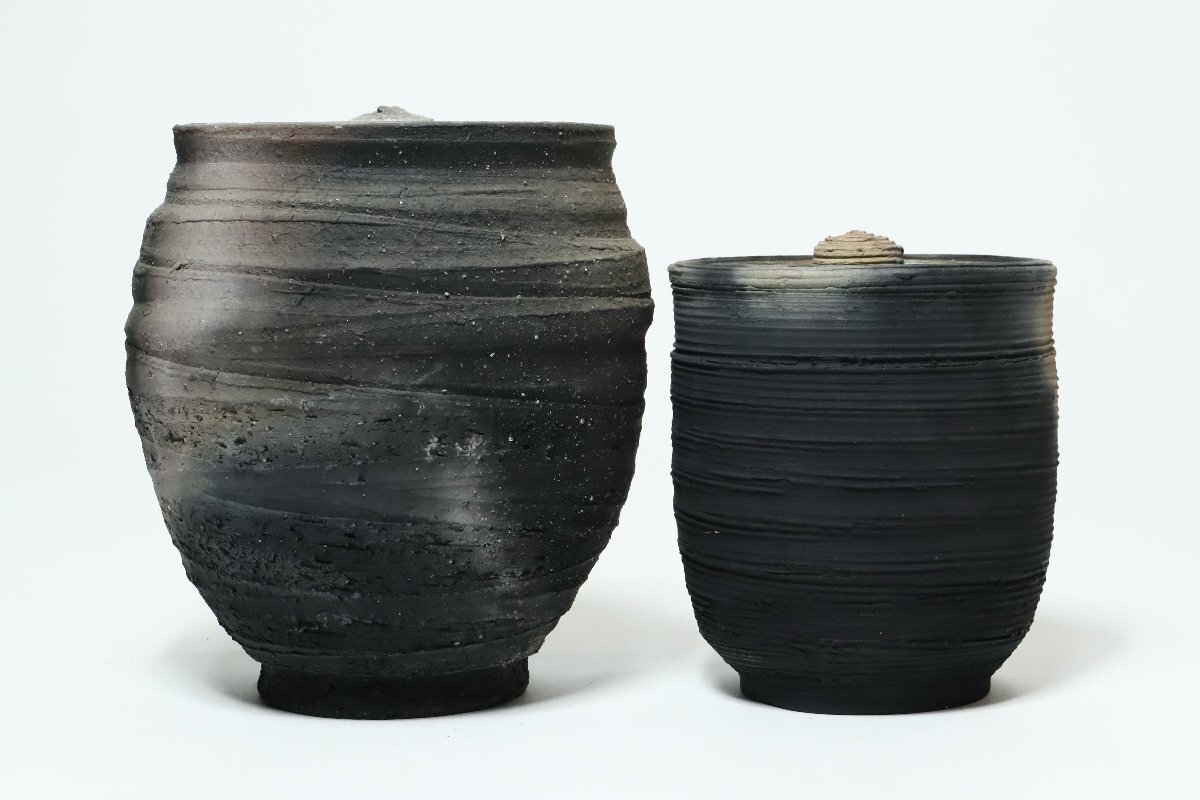 | ・坂田甚内 焼〆黒陶内蓋付壷 大小 二点セット /益子焼 沈香壺 蓋物 漬物 | ||||||||||