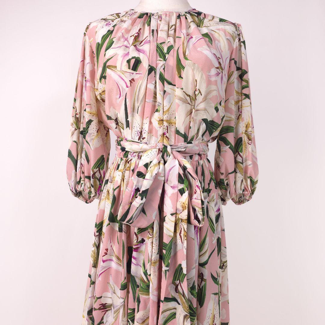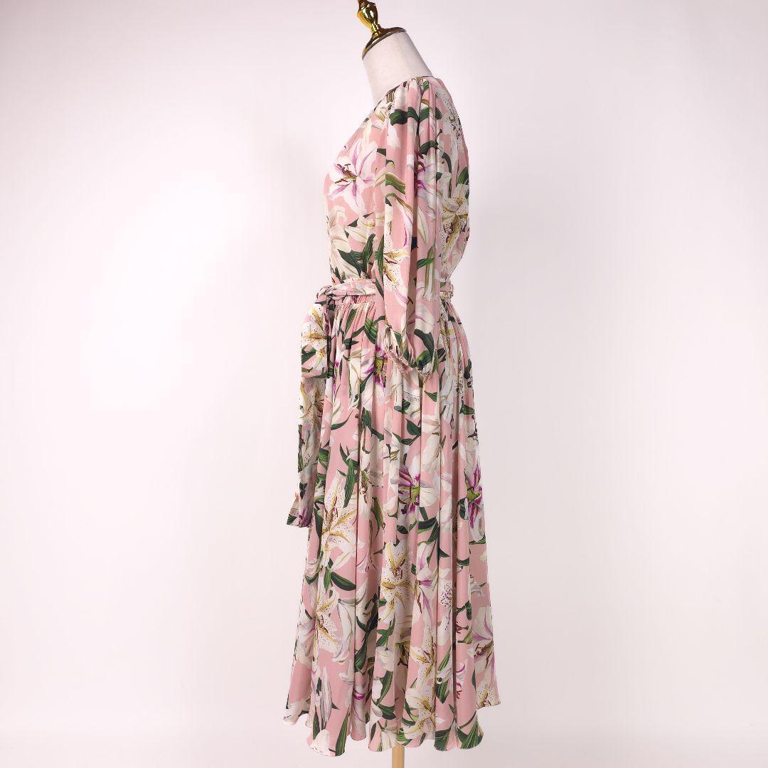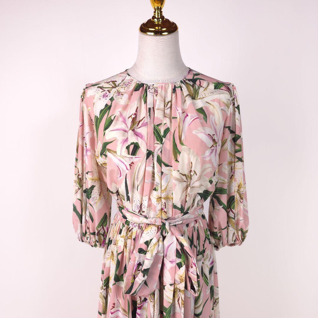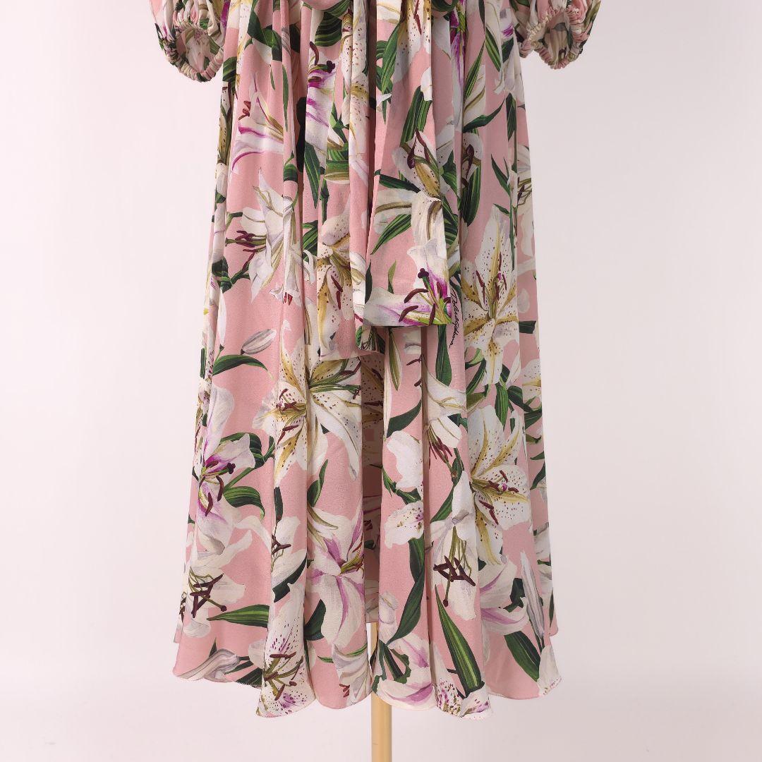 【新品同様】ドルチェ&ガッバーナ シルク ワンピース リリー ピンク Aライン DOLCE & GABBANA 40 花柄 リリー リボン ベルト