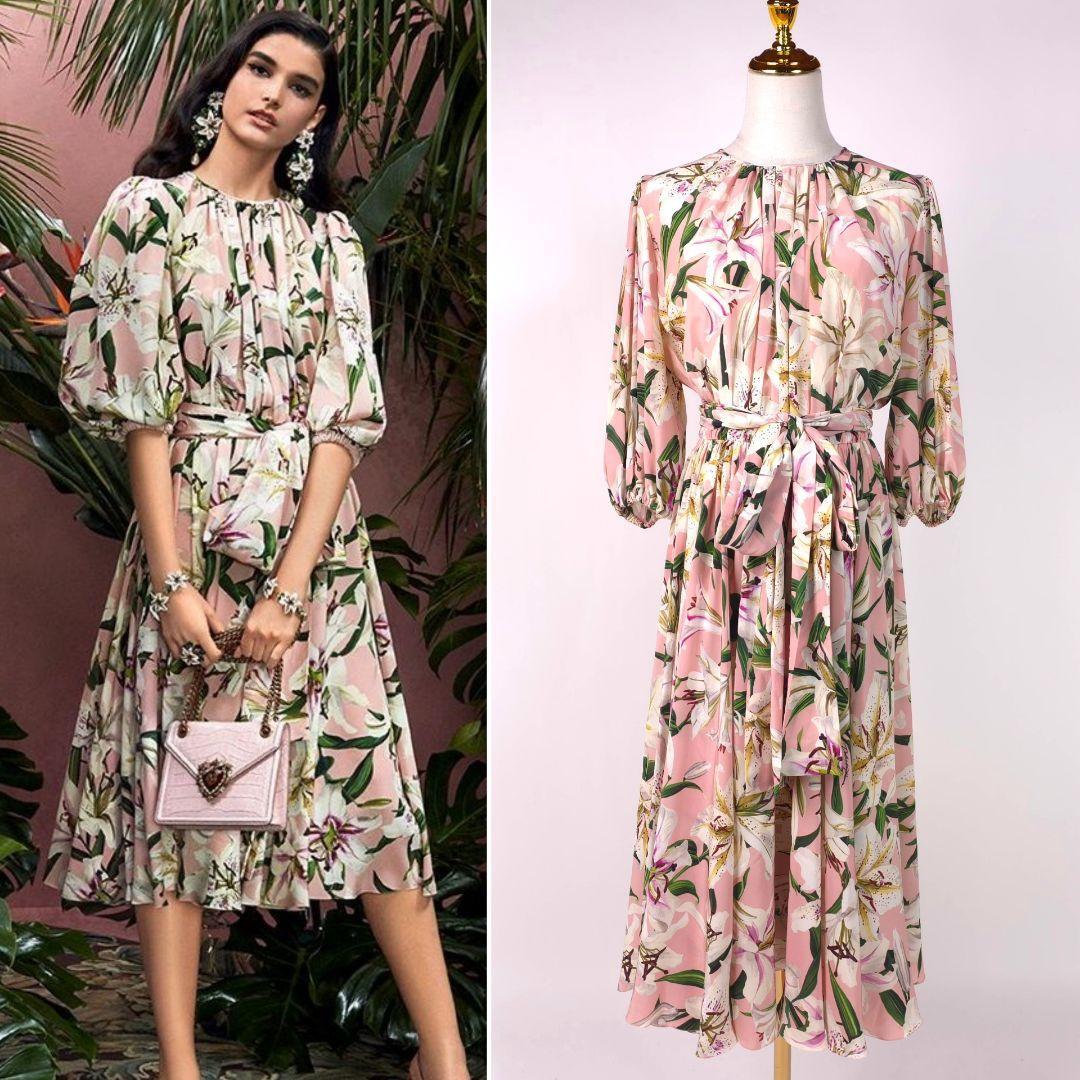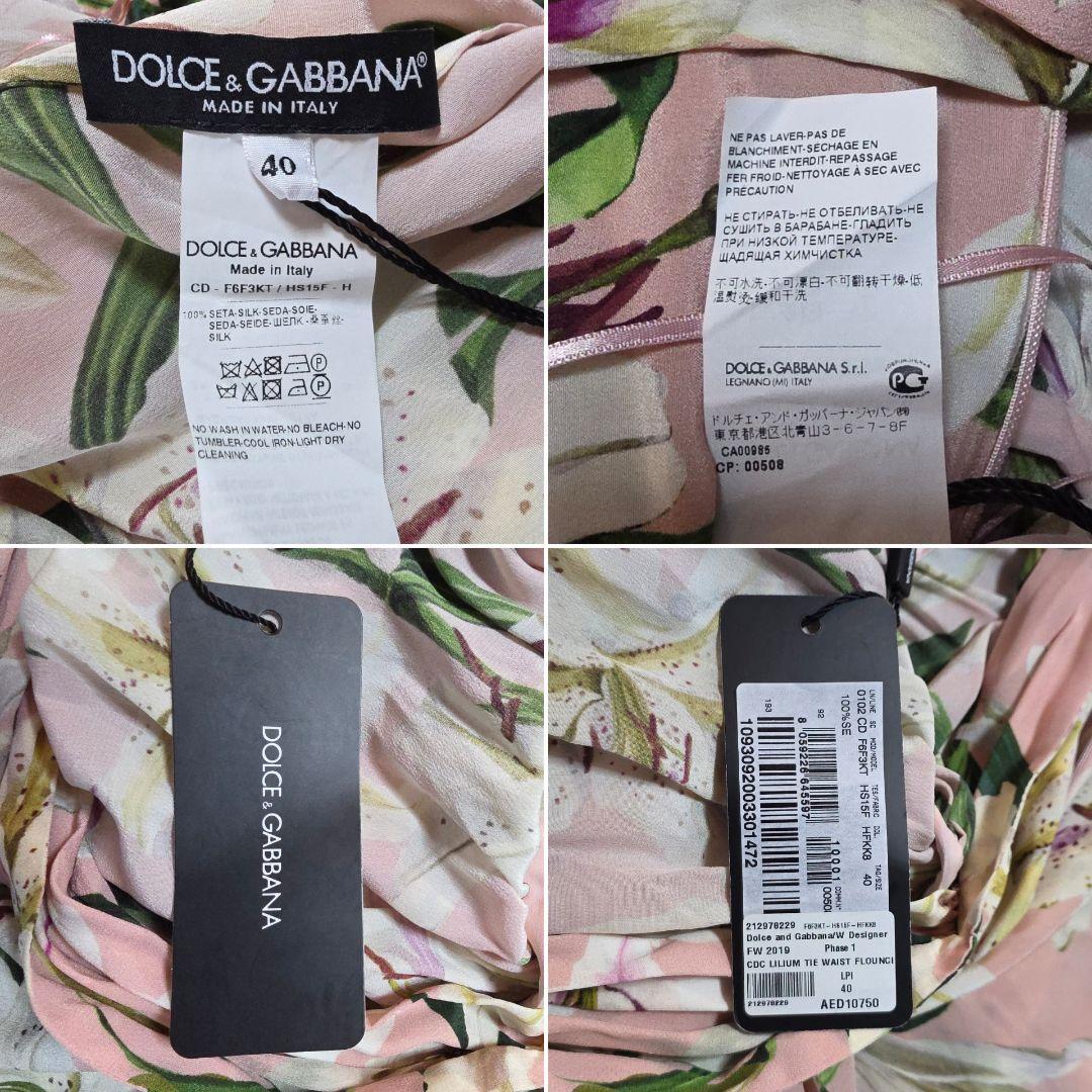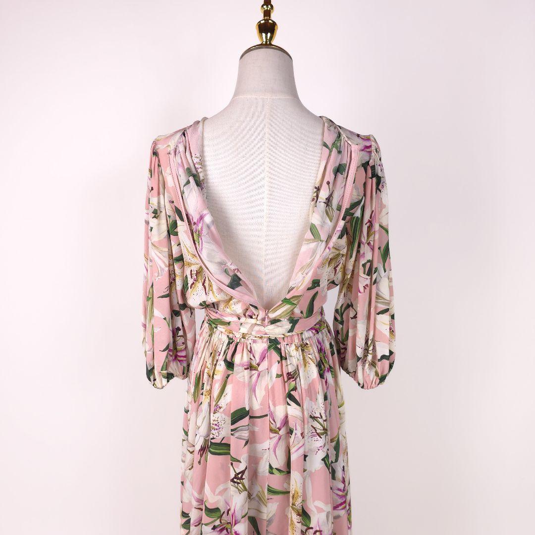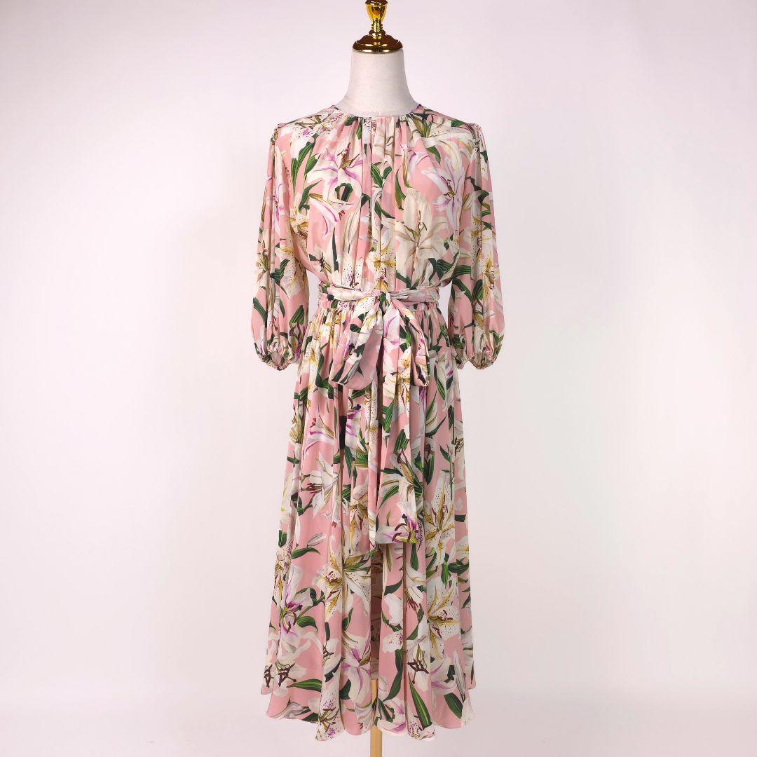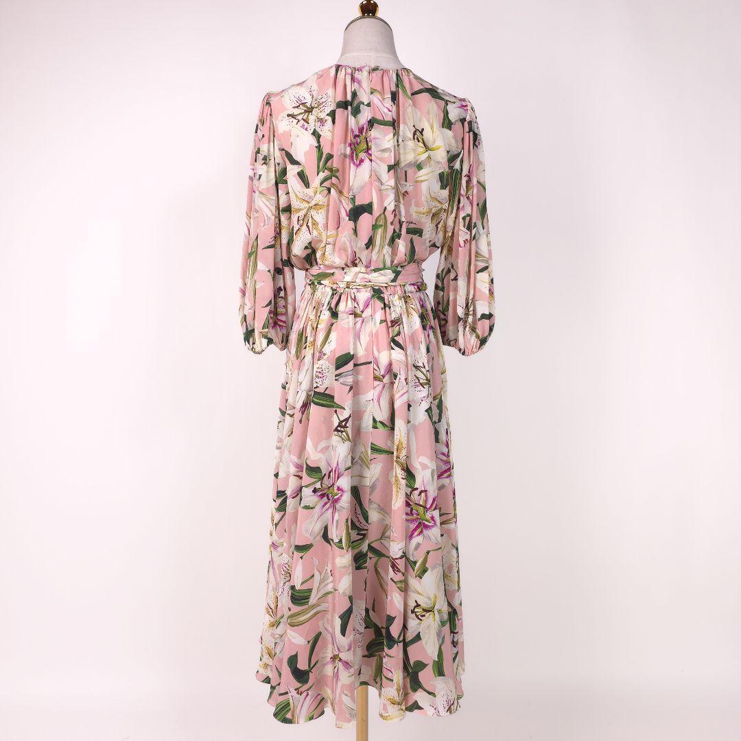 【新品同様】ドルチェ&ガッバーナ シルク ワンピース リリー ピンク Aライン DOLCE & GABBANA 40 花柄 リリー リボン ベルト