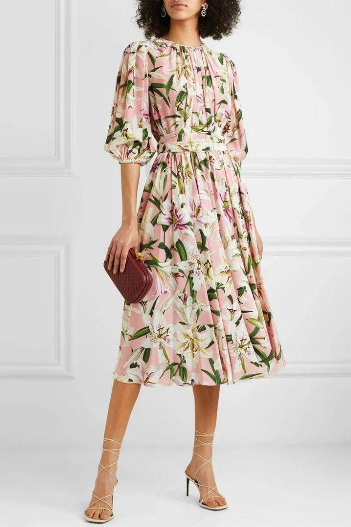 ドルチェ&ガッバーナらしいエレガントなリリープリントのAラインロングワンピース。