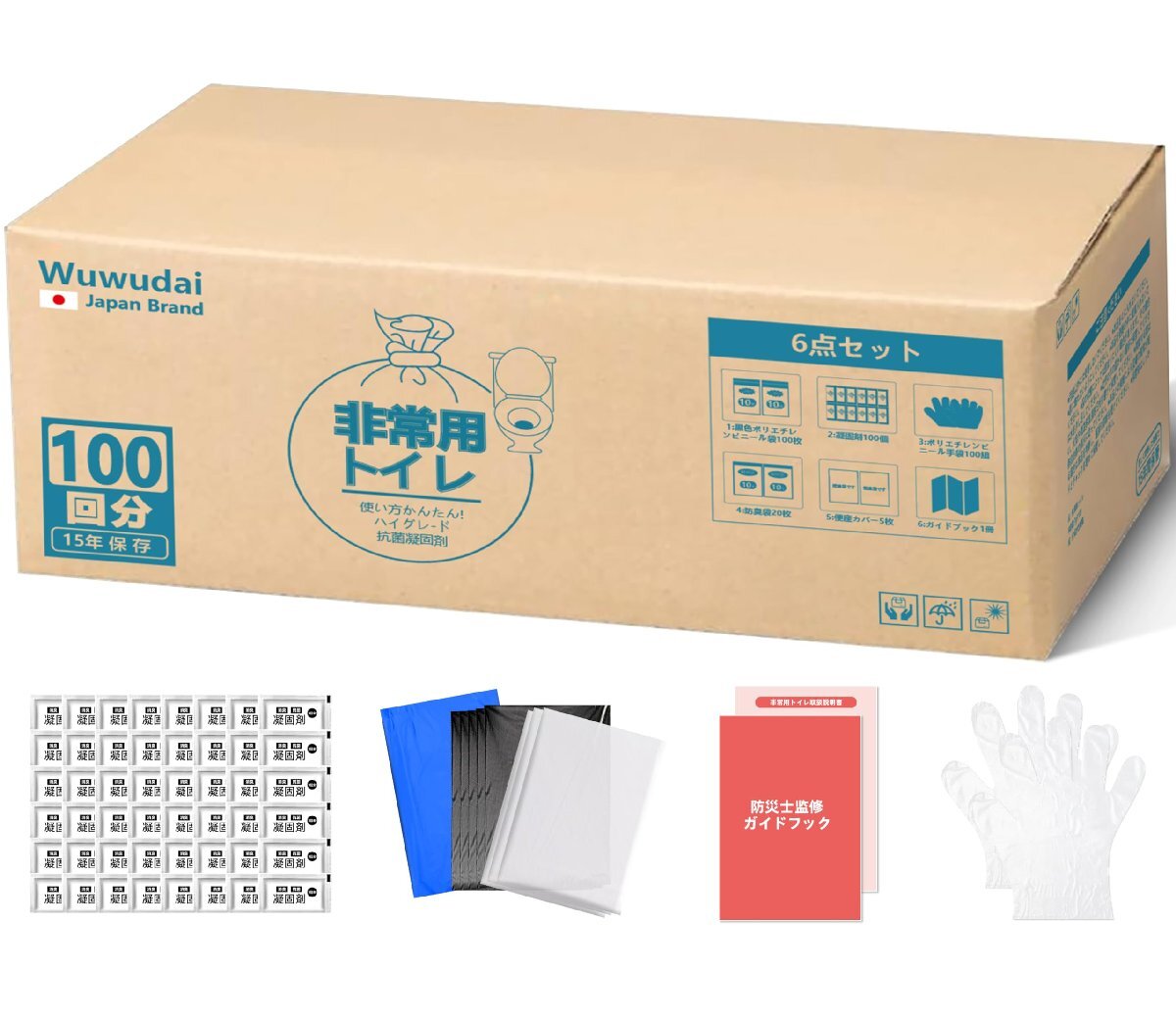 【防災士と共同開発最充実6点セット】凝固剤×100物袋×100防臭袋×20便座力バ-×5手袋×200防災ガイドブック一冊