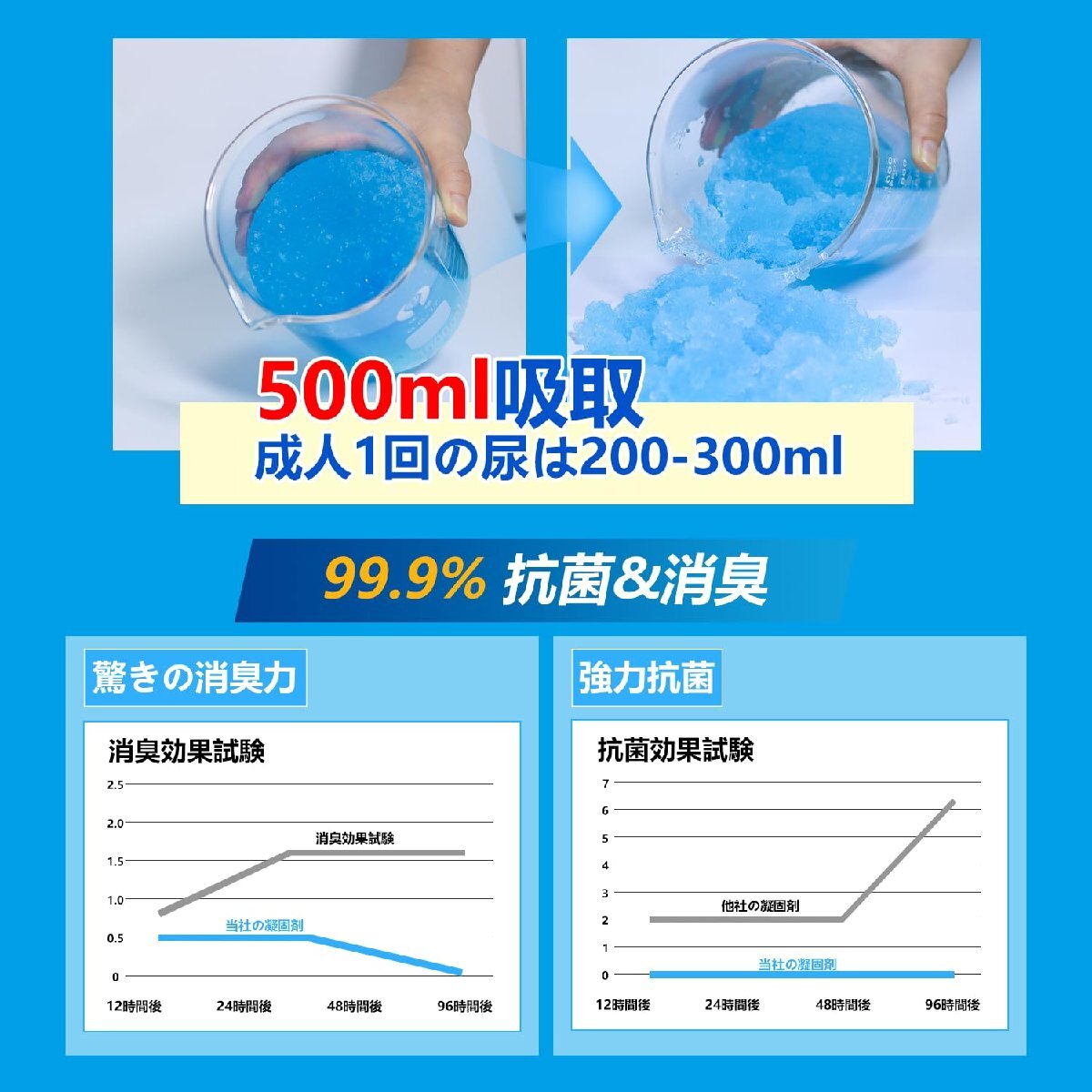 【抗菌・吸水・消臭性を兼ね備えた高性能凝固剤を採用!】では、高性能凝固剤を採用しています。凝固剤1つにつき、500ml吸収可能で15秒で固めることができます。また、劣化しにくいアルミ製のパッケージを使用し、15年の長期保管を可能にしました。