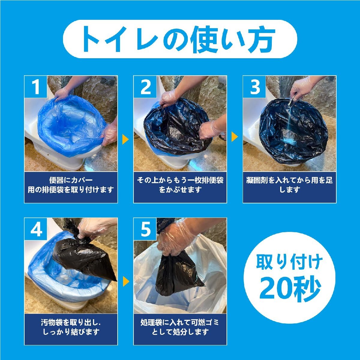 【便器カバー・手袋付きで衛生的に】ポリエチレンの手袋100組と便器カバー5袋を付属。手袋は100組あるため毎回新しいものを利用でき、廃棄袋を取り替える際に手に便器の水や糞便がつかず汚れません。便器カバーをつけたままにしておくことで、黒い袋が便器の水濡れないため廃棄も楽々です。