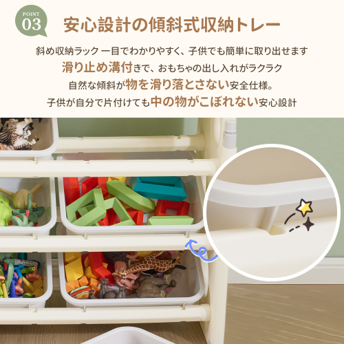 • 【安心設計の傾斜式収納トレー】斜め収納ラック 一目でわかりやすく、子供でも簡単に取り出せます滑り止め溝付きで、おもちゃの出し入れがラクラク自然な傾斜が物を滑り落とさない安全仕様子供が自分で片付けても中の物がこぼれない安心設計