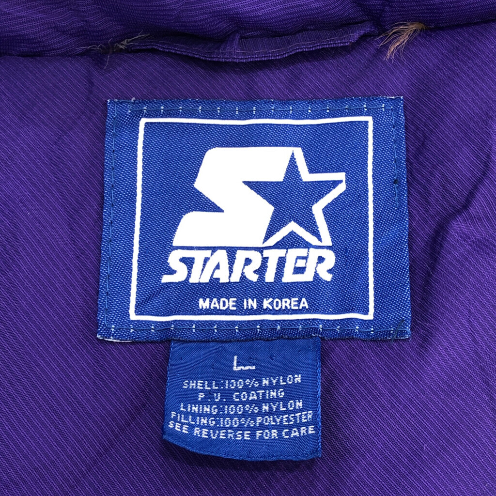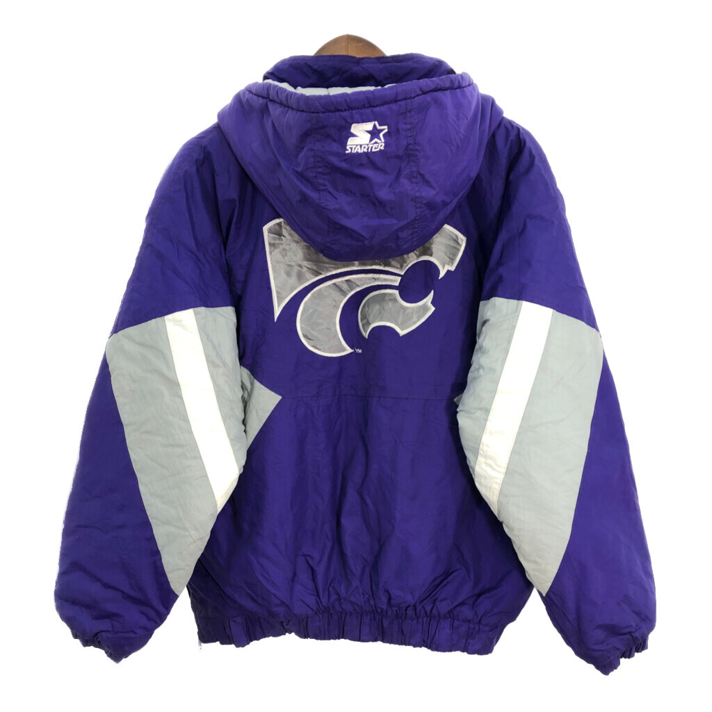 | [商品管理番号] R1296 [ブランド] STARTER/スターター [サイズ] L [実寸サイズ] 着丈:約71cm 身幅:約72cm 裄丈:約93cm 袖下丈:約53cm [主な素材] 表地 : ナイロン 裏地 : 13848 中綿 : 13897 [色] パープル [仕様] 90年代 ハーフジップ、中綿 ナイロン 裏地キルティング NCAA カンザス・ワイルドキャッツ [状態] 汚れ:全体、首元、袖、胸、腹部 特記事項:使用感あり | |||