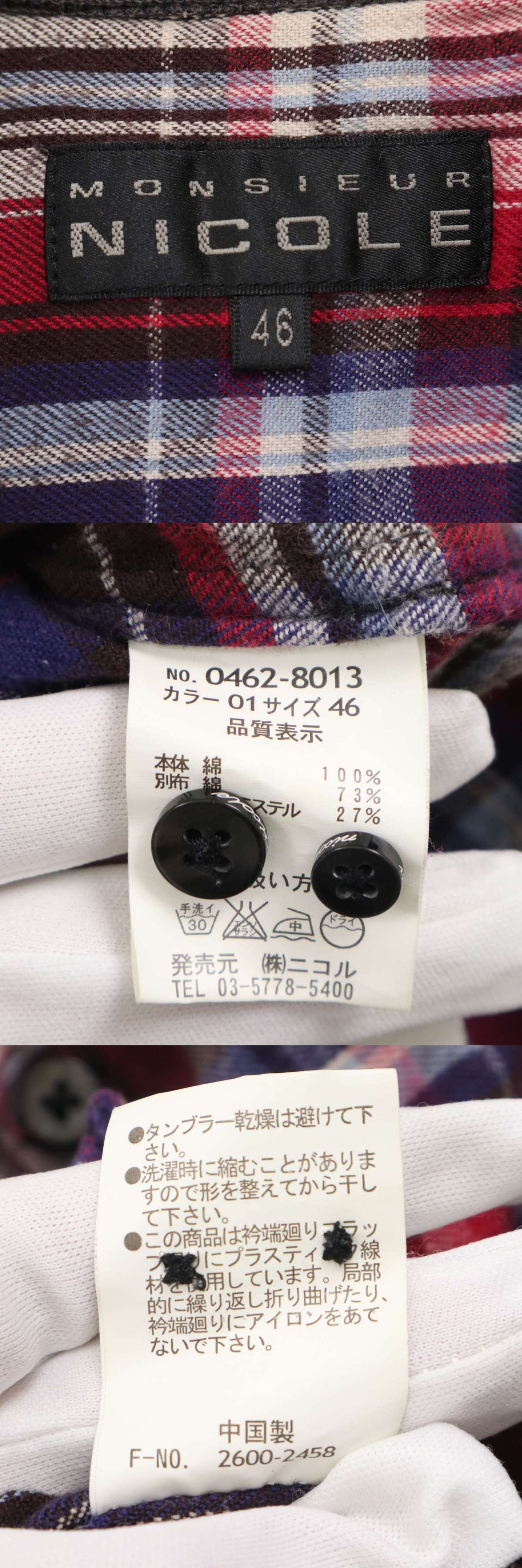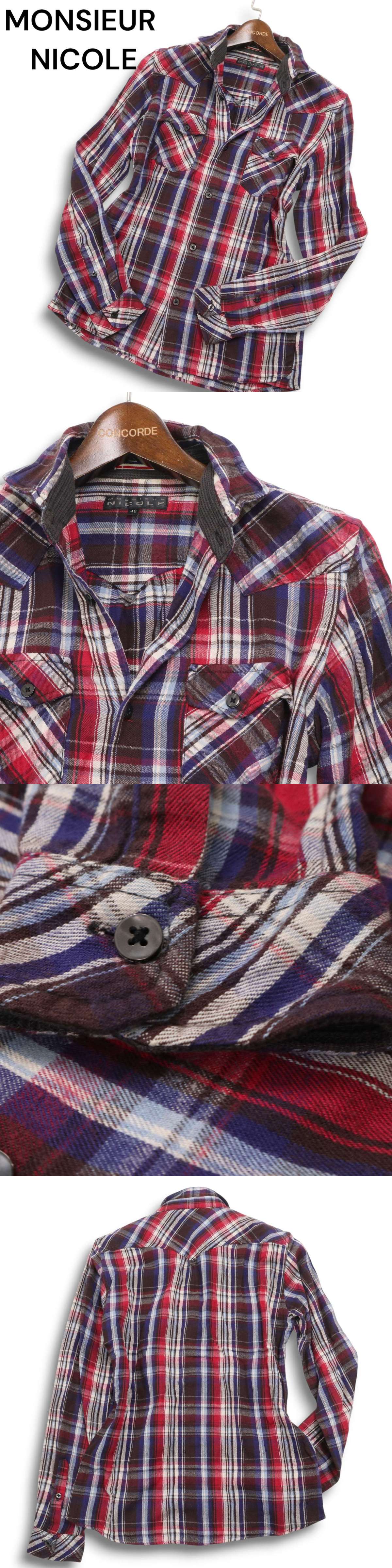 MONSIEUR NICOLE ムッシュ ニコル 秋冬 襟ワイヤー★ 長袖 ウエスタン チェック ネル シャツ Sz.46 メンズ