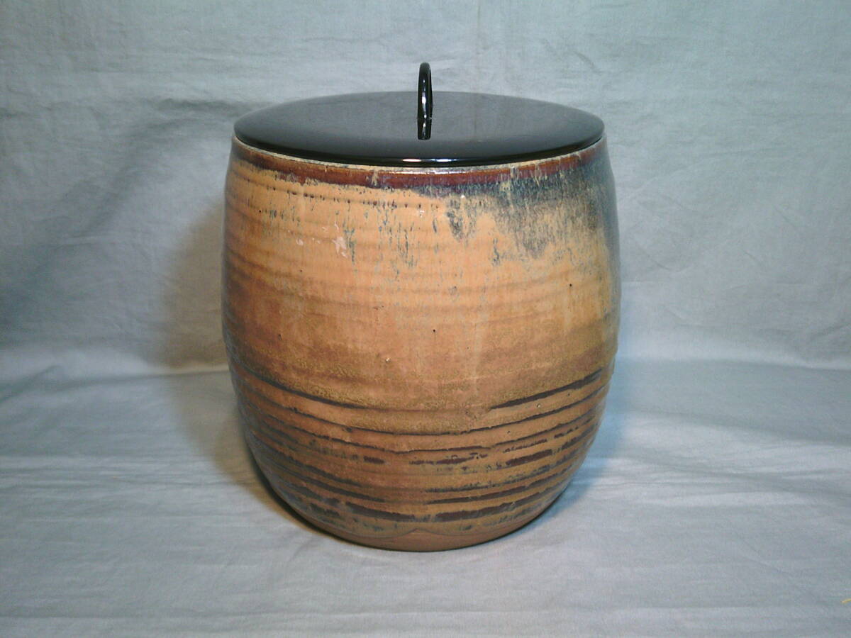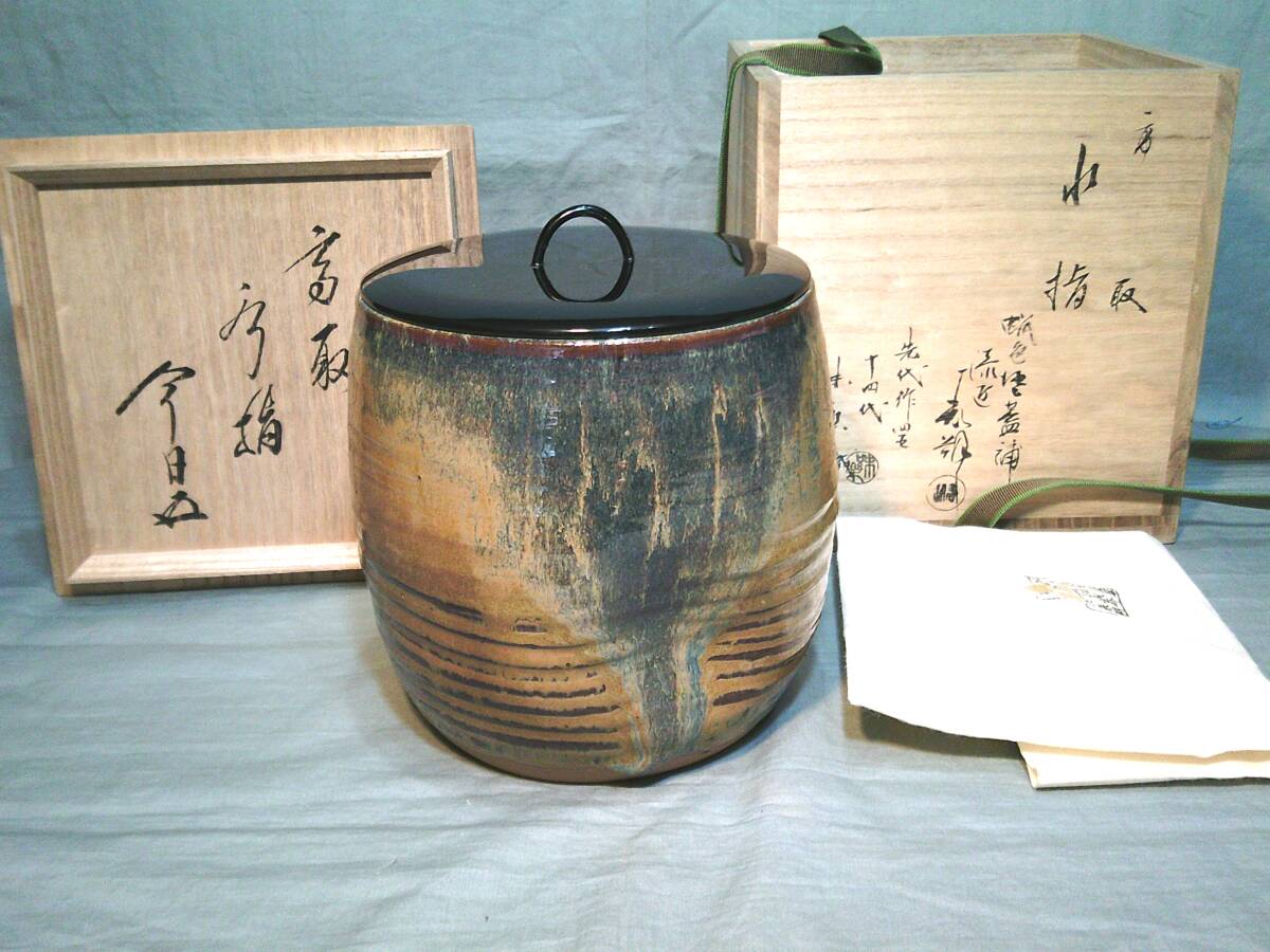 【商品説明】14代亀井味楽識箱で先代(13代)味楽の高取水指。裏千家-鵬雲斎の書付あり。蓋は鈴木表朔さんの蝋色塗蓋です。