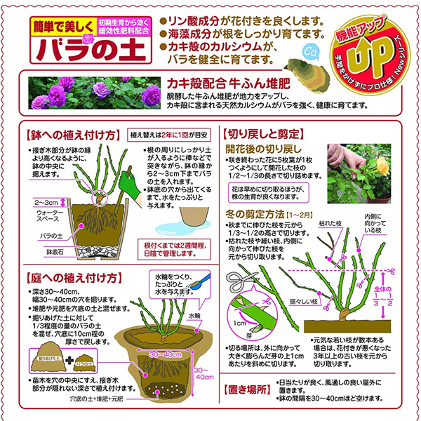 ・醗酵した牛ふん堆肥が地力をアップし、カキ殻に含まれる天然カルシウムがバラを強く、健康に育てます。