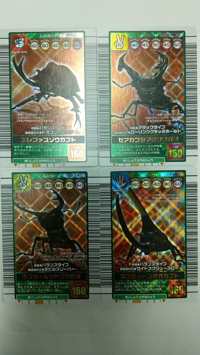 甲虫王者ムシキングの2003年秋3弾の銅レア(160ムシ) 【エレファスゾウカブト】 【セアカフタマタクワガタ】 【ネプチューンオオカブト】【ラコダールツヤクワガタ】 4種コンプセットになります。 2003年秋バージョンは1~3弾まで稼働し、ムシの性格分けの影響で 1弾【丸数字 小(性格有り)】【オレンジグラフ(性格無し)】 2弾【丸数字 大(性格有り)】【イエローグラフ(性格無し)】 3弾【丸数字 大(性格有り)】 と変遷し、各バージョン分けもなかなか難しく、コレクションが困難なバージョンです。 2003年秋バージョンは2弾と3弾では【エレファスゾウカブト】【セアカフタマタクワガタ】【ラコダールツヤクワガタ】の 3種は表デザインが同一なのでオークション等では判別が難しく、バージョン毎の入手に手間がかかります。 お探しの方はこの機会にいかがでしょうか。 カードはノースキャン品ですが、200ムシ(金レア)や一部の希少カード以外はスリーブ等に入れずに そのまま大量に保管していたものになります。 目立つダメージがあるものは除外しており状態は概ね良好かと思いますが、白欠けや排出キズ、経年劣化など状態の感じ方には個人差がございます。 完品をお探しの方、過度に状態にこだわる方は念のため入札をご遠慮ください。 また欠品補充用に単品での対応も可能です。 ご希望の方は1枚580円にて別途対応させていただきますので遠慮なくお問い合わせください。 |