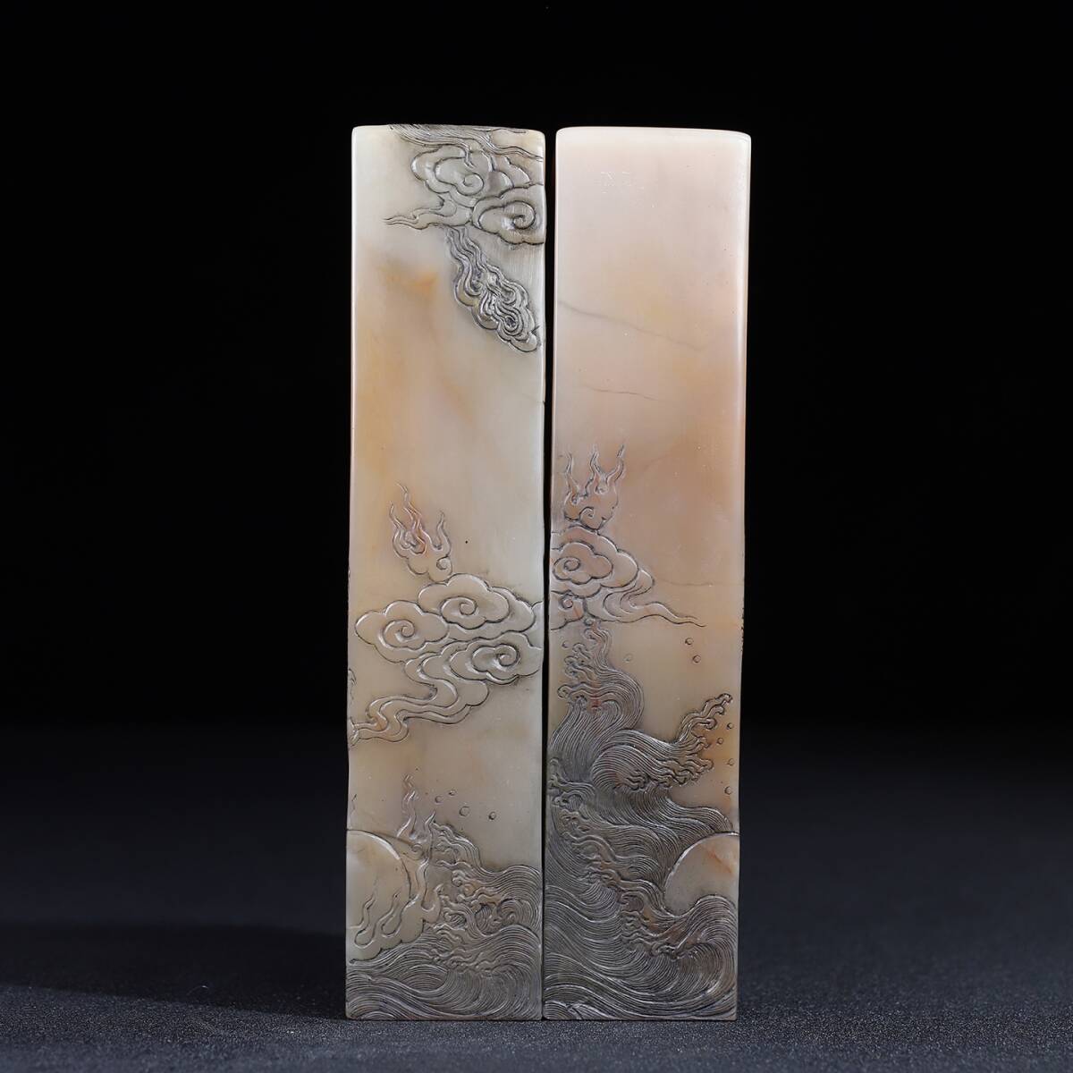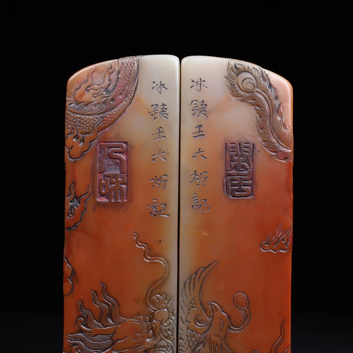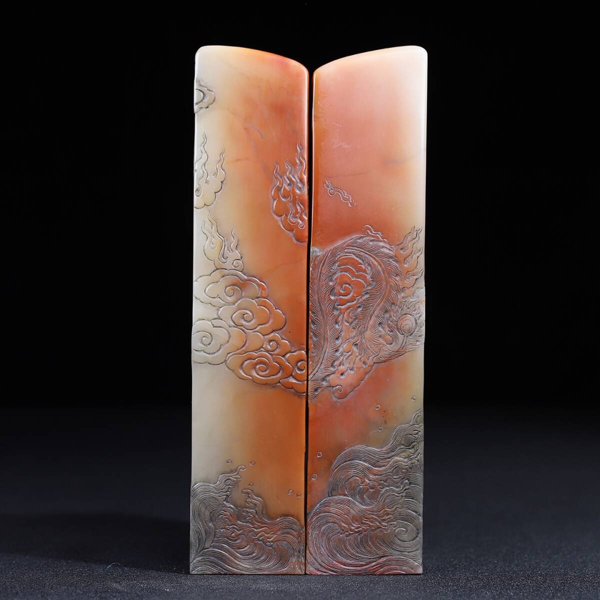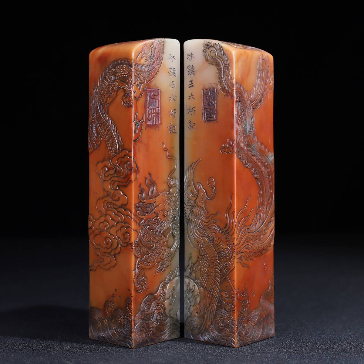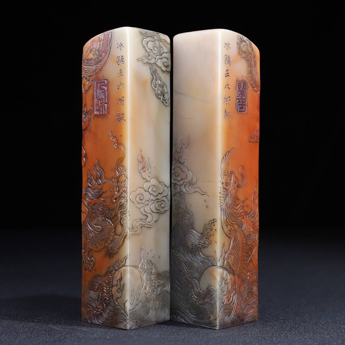 *珍品旧蔵* 清 寿山石 彫刻 龍鳳祥 薄意印鑑ペア 天然石 手彫 篆刻 古印材 極細工 中国古玩 骨董品 古美味 H48