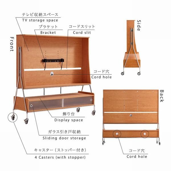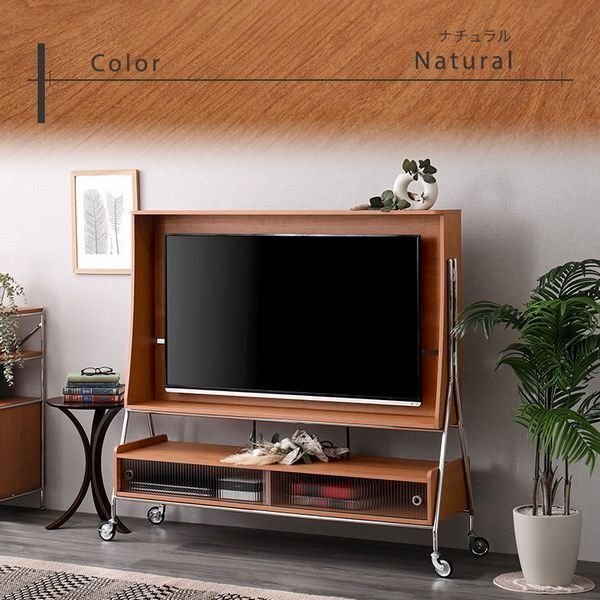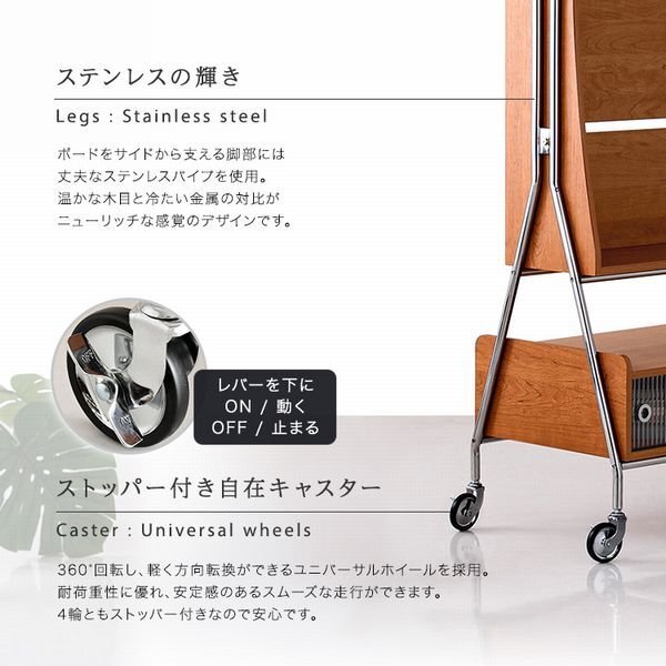 | キャスター付きテレビスタンドシェルフ! ステンレスとナチュラルな木目を組み合わせたスタイリッシュなデザインでお部屋を彩ってくれます。 キャスター付きなので、移動するのも楽々です。 |