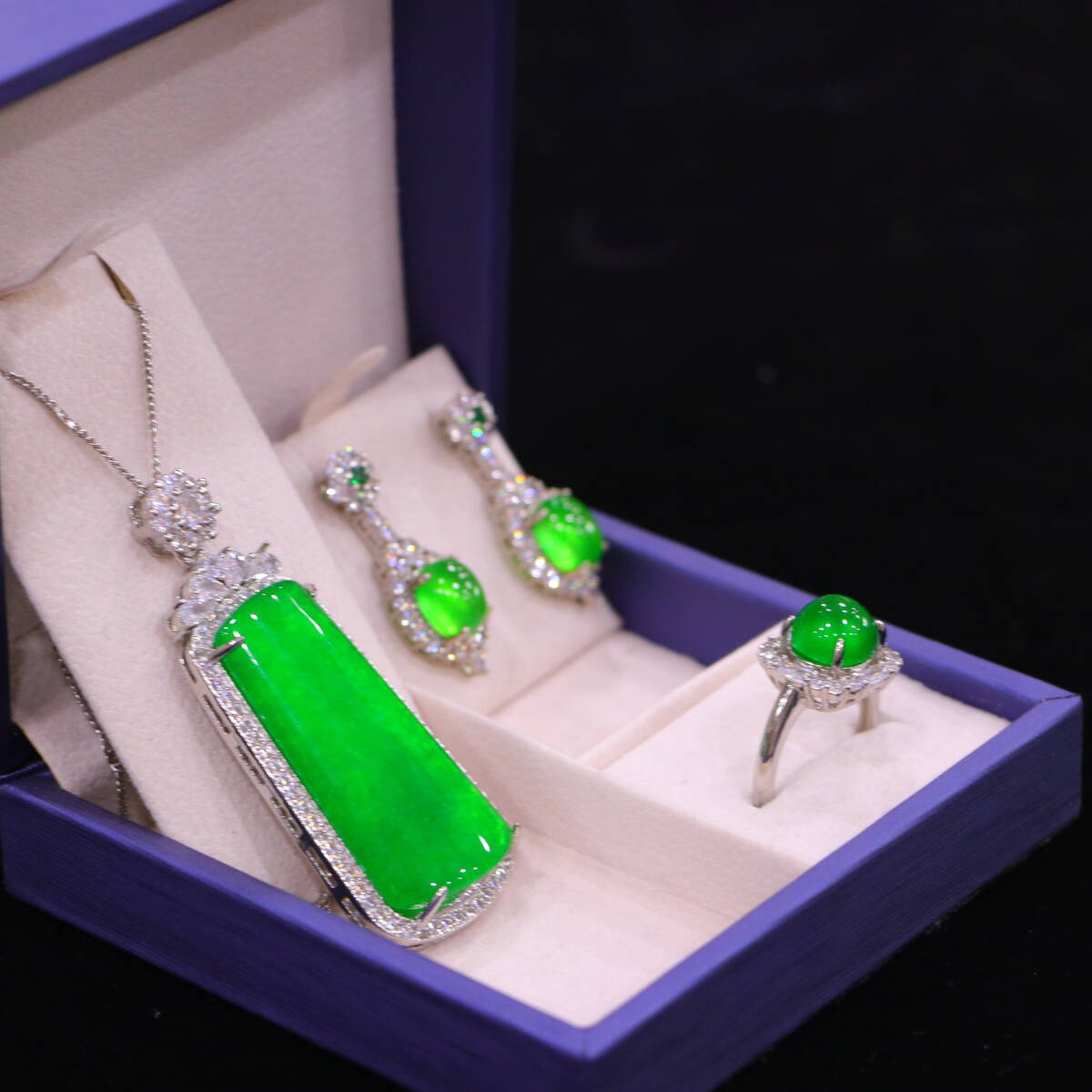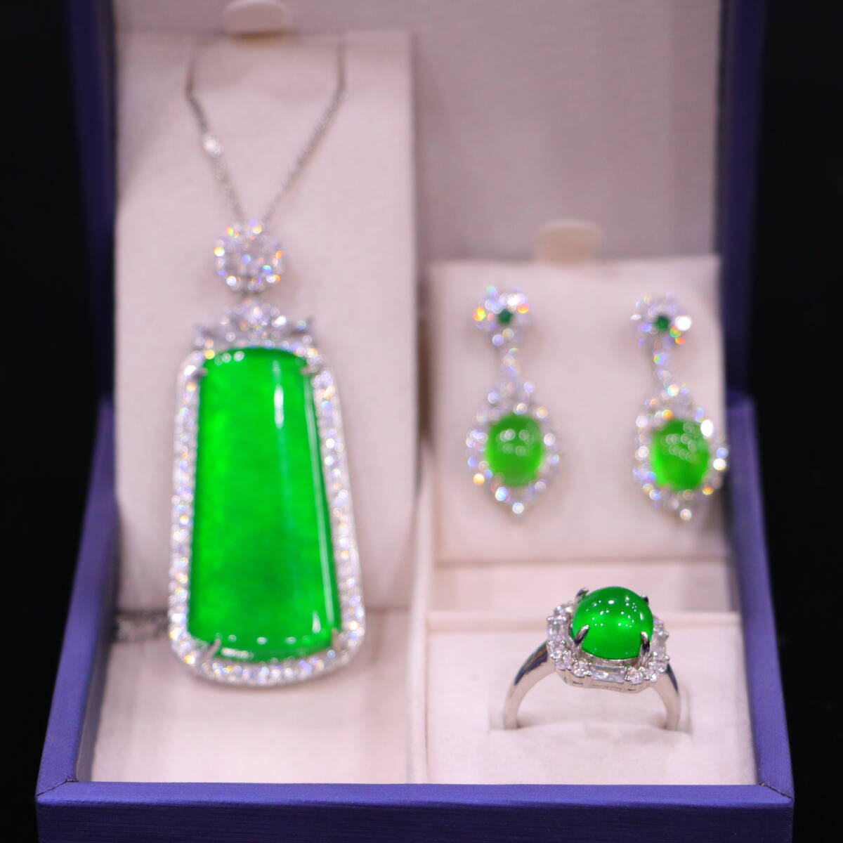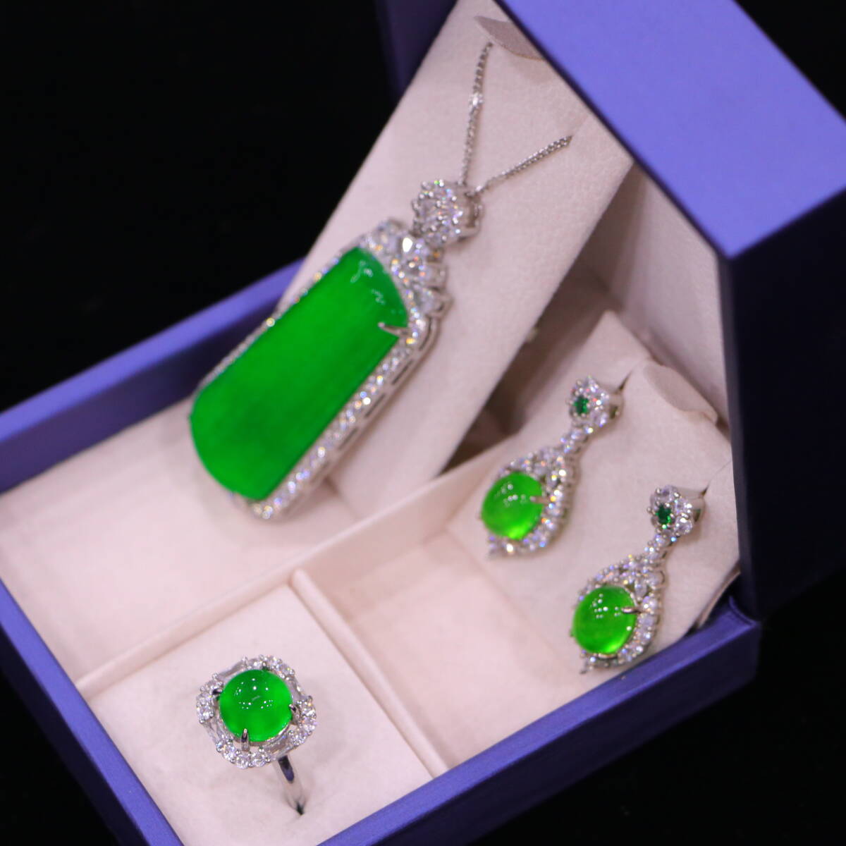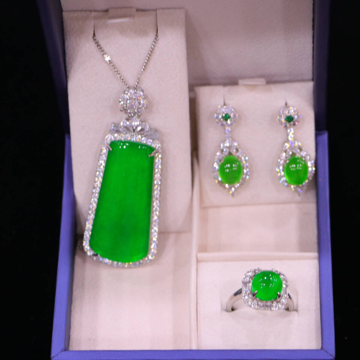 代 宮廷御藏 高氷 帝王綠 翡翠彫 綠翡翠 平安牌 項鏈 戒指 耳飾三件套 箱付 置物 時代物 古董品 骨董 旧家蔵出し 唐物 中国古玩 古美術品