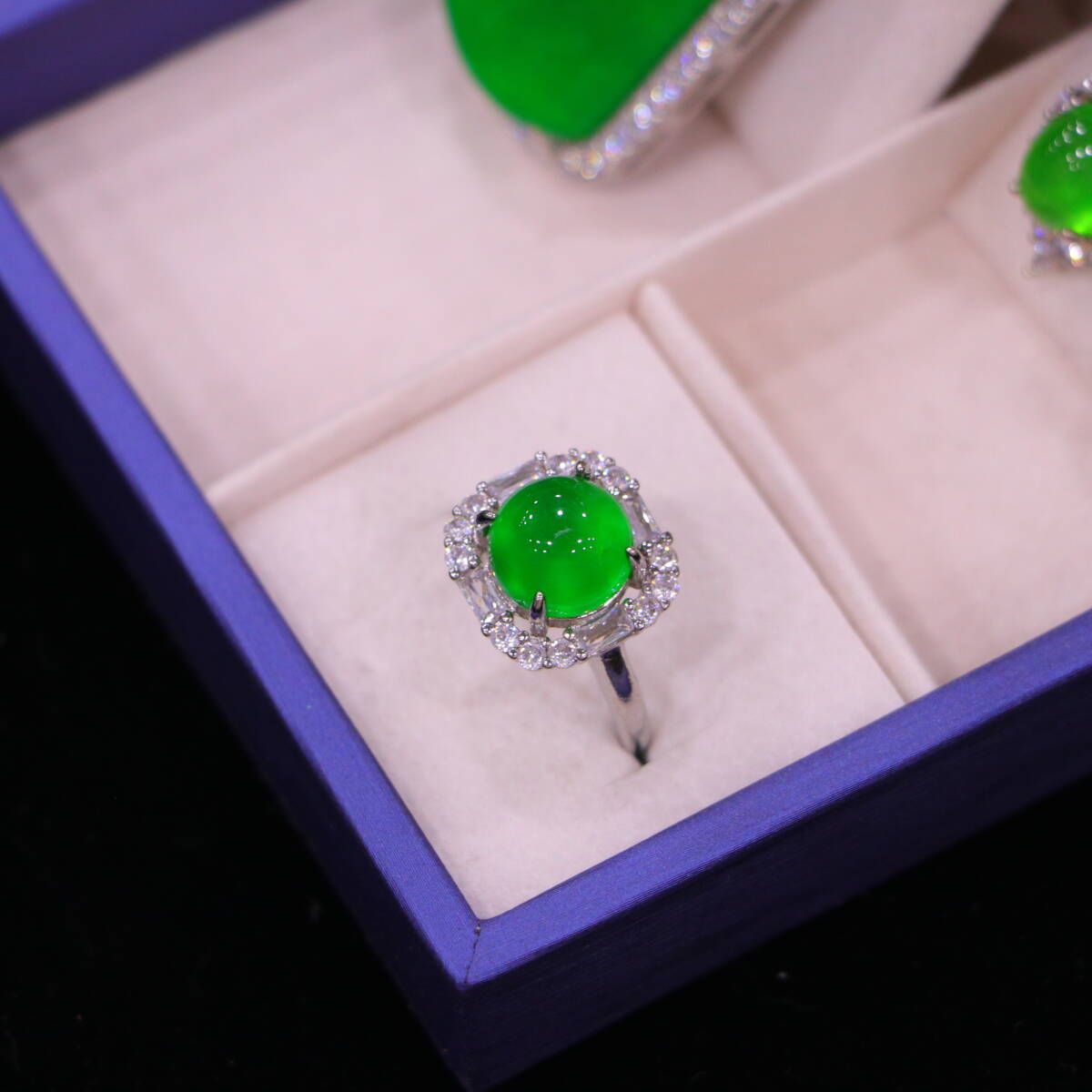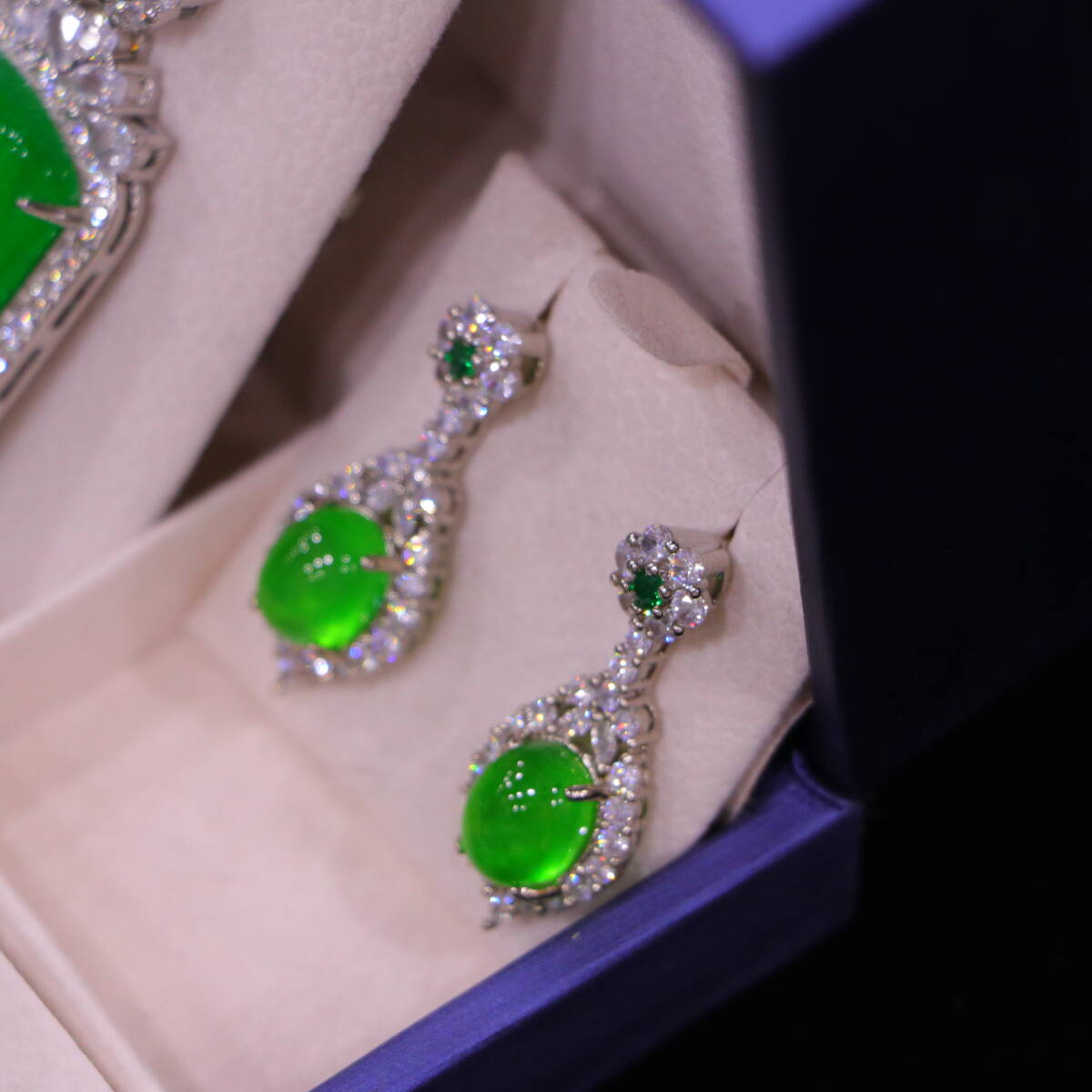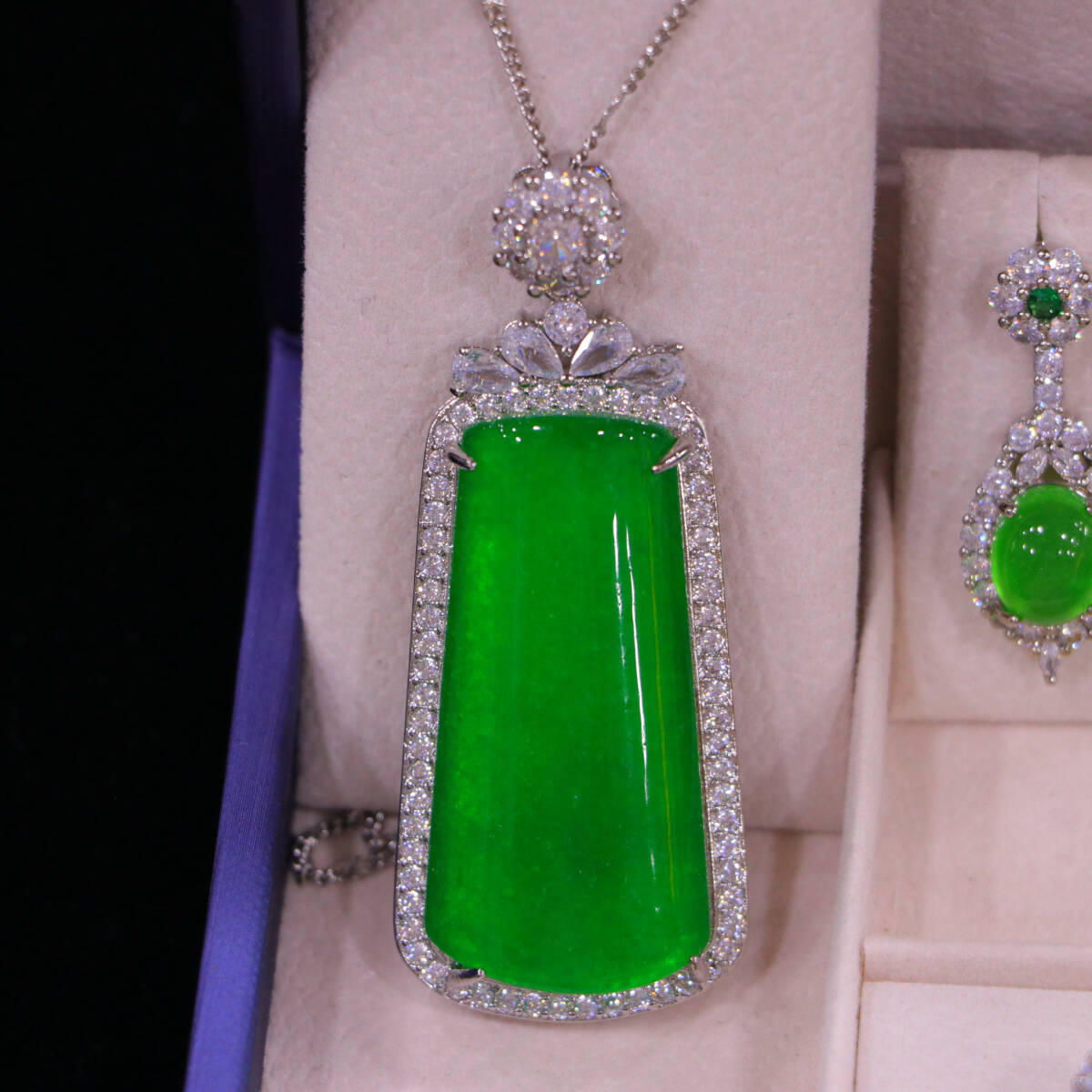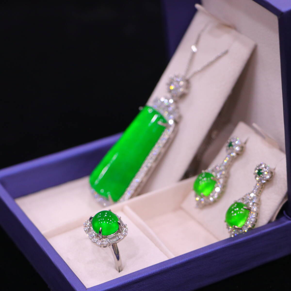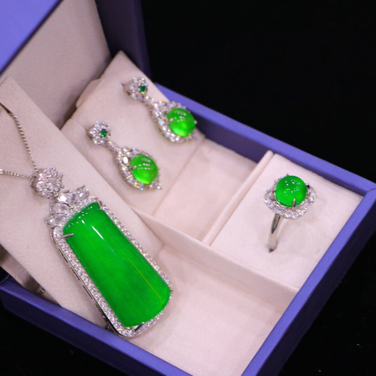 代 宮廷御藏 高氷 帝王綠 翡翠彫 綠翡翠 平安牌 項鏈 戒指 耳飾三件套 箱付 置物 時代物 古董品 骨董 旧家蔵出し 唐物 中国古玩 古美術品