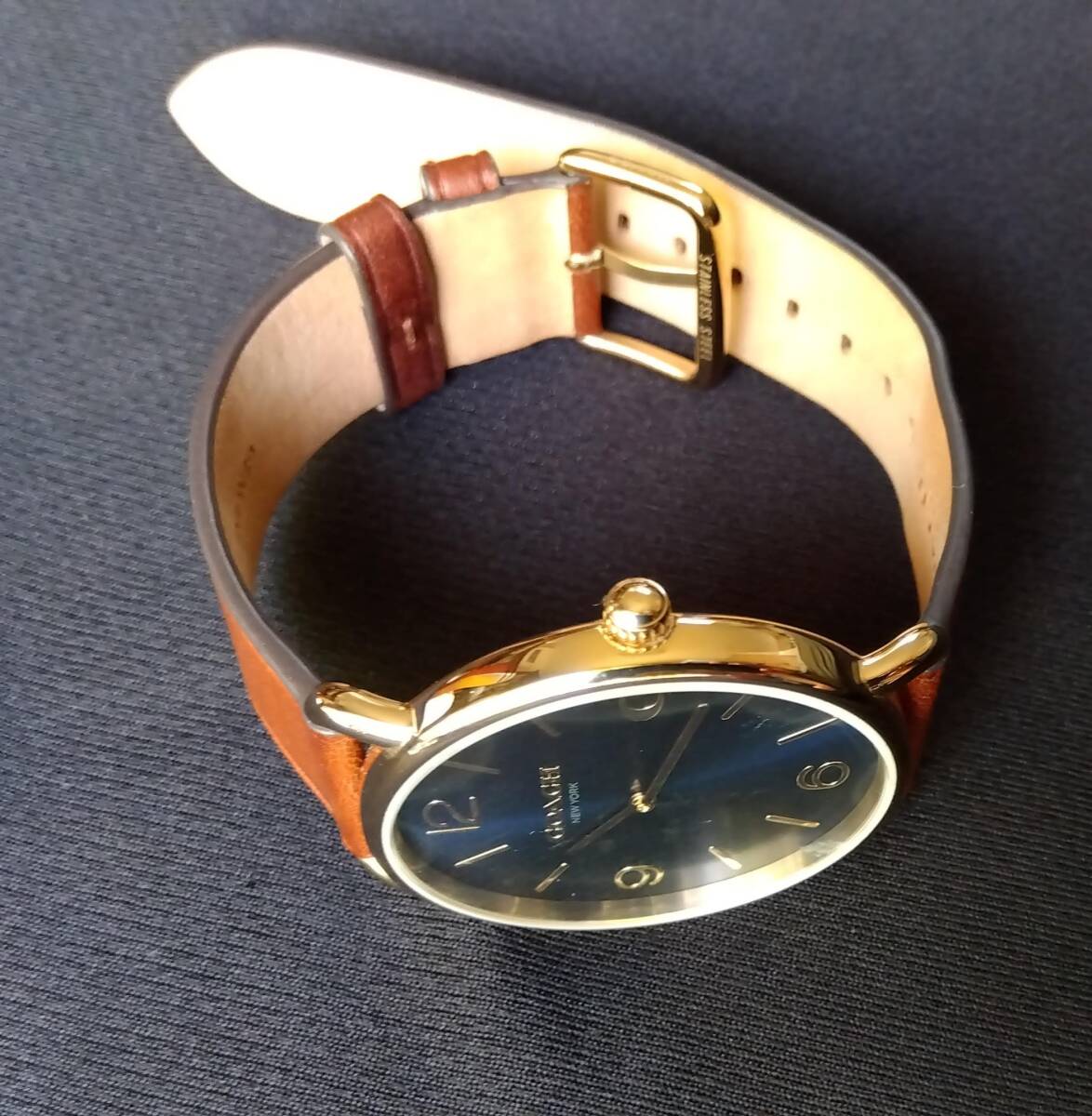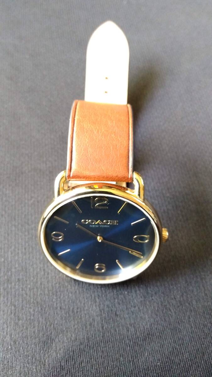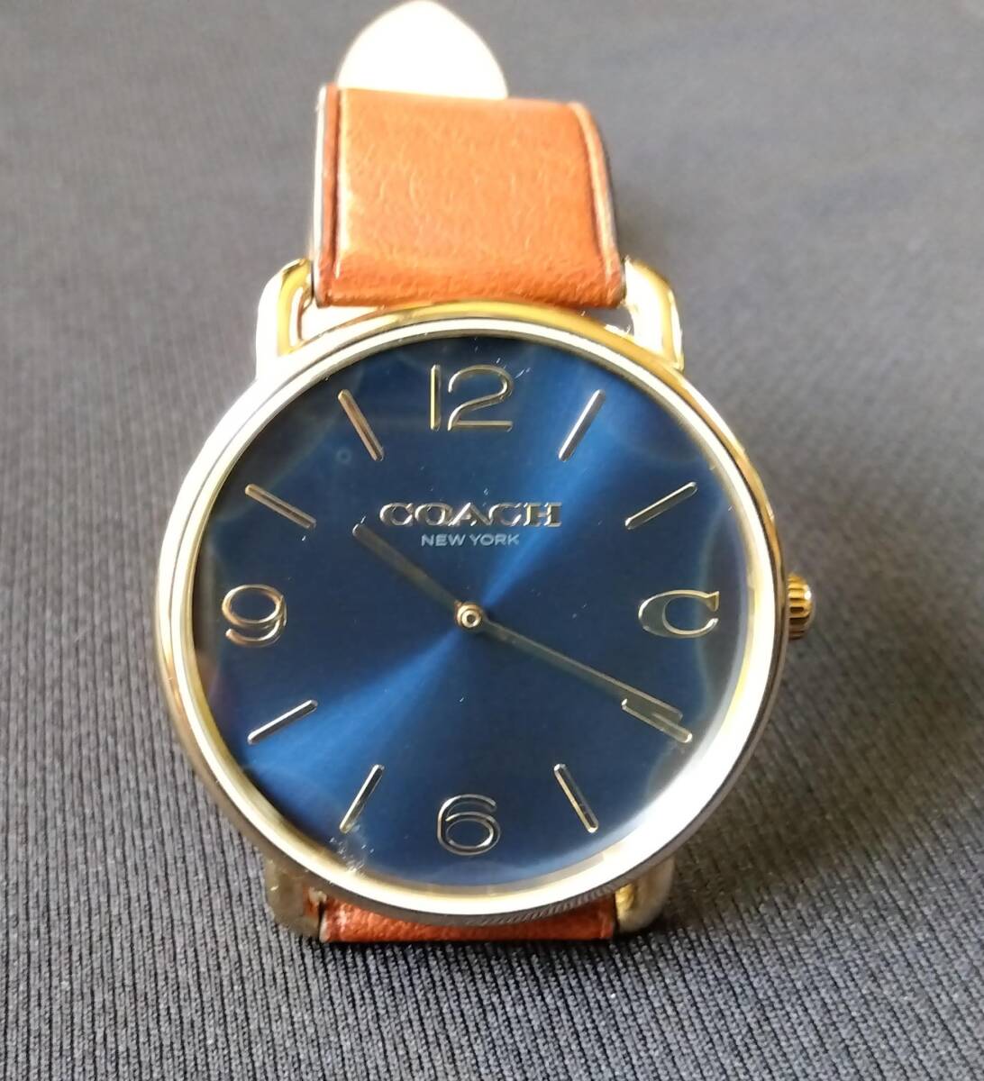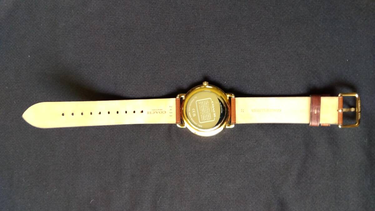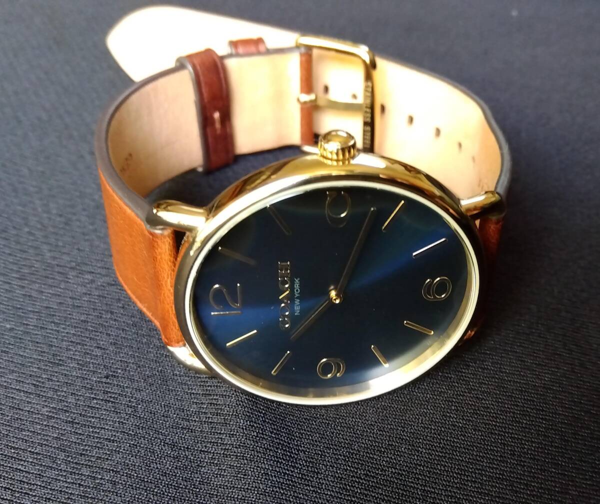 【稼働 美品】COACH コーチ 腕時計 二針 クォーツ QZ ラウンド ゴールド 文字盤:ブルー レディース CA.158.2.34.2334 商品説明 シンプルなクォーツ式二針デザインで、日常使いに適した実用的なモデルとして作られています。ただし、ゴールドケースとブルー文字盤の組み合わせが特徴的で、ブランドのエレガンスとシンプルさを兼ね備えた美しいデザインが、このモデルの最大の魅力です。 COACH(コーチ)は、1941年にニューヨークで創立されたグローバルファッションブランドです。その始まりは、職人によるレザーアイテムの製作からで、特に丈夫で実用的な革製品で知られるようになりました。現在では、バッグ、財布、腕時計、靴、アパレルなど多彩なアイテムを展開しています。デザイン面では伝統を大切にしつつも、現代的なスタイルを取り入れており、年代や性別を問わず幅広い支持を集めています。また、リーズナブルな価格帯と高い品質のバランスもブランドの特徴です ◆商品詳細 COACH コーチ 腕時計 二針 クォーツ QZ ゴールド 文字盤:ブルー 型番:CA.158.2.34.2334 レディース ◆サイズ 腕周り20cm 穴5mm間隔10穴 ケース サイズ: 43mm X 46mm ケース 厚み: 8mm 重量: 43gms ◆カラー: ゴールド ◆素材: スチール ◆コンディション: 気付かない程度の使用感のみで非常に程度の良い品 動作:稼動 風防:美品 ベゼル:美品 裏蓋:美品 ベルト:純正 リューズ:良好