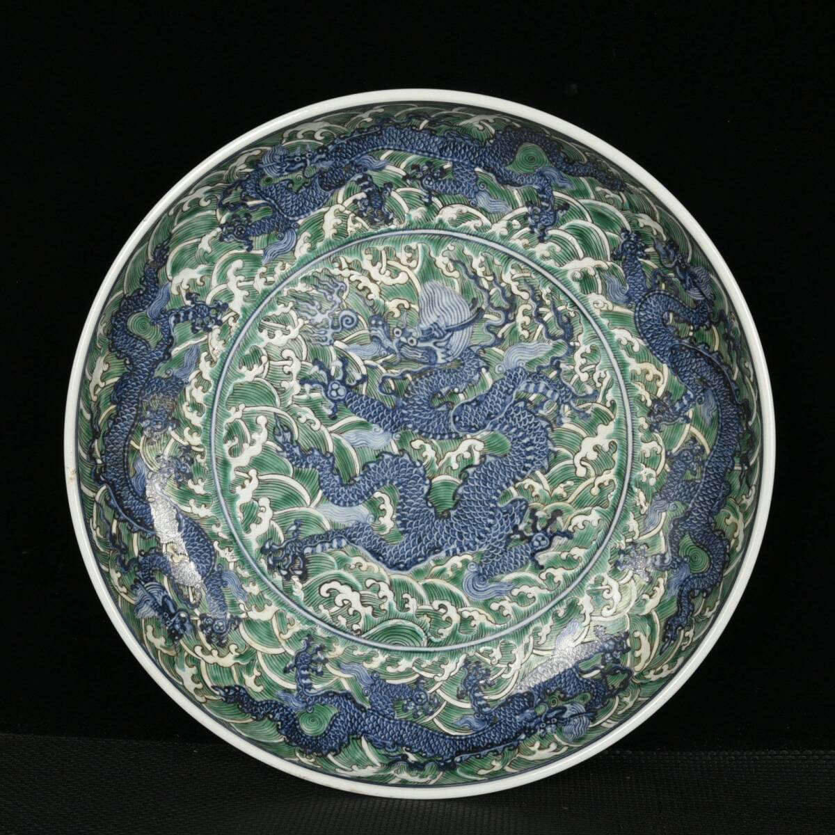旧蔵 明 宣德年製 青花 緑彩海水五竜紋皿 陶芸 古陶磁器 中国磁器 極細工 中国古玩 骨董品 古美味 208