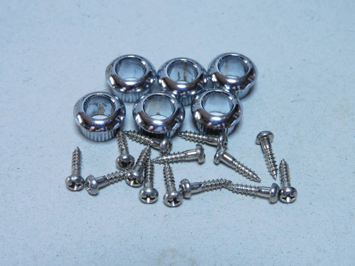 1980年代日本製ストラトキャスターモデル、おそらく国産フェンダーフェンダージャパンのスクワイヤーストラトに使用されていた6連カバードペグ「クロームメッキ」です。年相応のメッキのヤレや経年劣化、スレ等はありますがガタはなく中古美品です。点検済みで現状使用可能です。状態は画像でご確認ください。新品取り付けネジ12本とブッシュ6個が付いています。出品物は画像でご確認ください。当方にて簡単なクリーニングはしていますが必要なメンテナンスやクリーニングは落札者様でお願いします。画像にあるものが全てです。画像やコメントをご参考に入札お願い致します。それではオーションが終わりますまでよろしくお願い致します。中古点検品の為落札後のクレームやキャンセルはご遠慮下さい。またオークション開催中の入札の取り消しもお受け出来ません。あくまでも中古品なのでキズや経年劣化等些細な事や、完璧な商品をお考えの方は入札をお控え下さい。ご理解の上ご入札下さい。発送は「レターパックライト」で430円です。