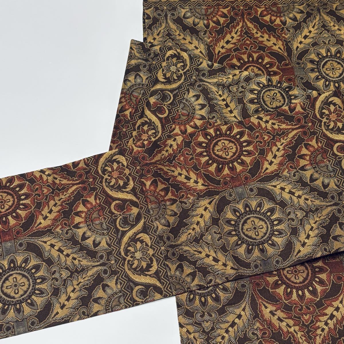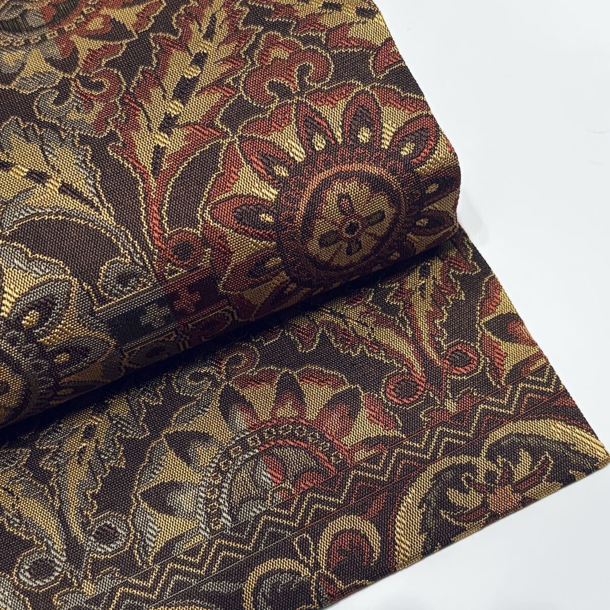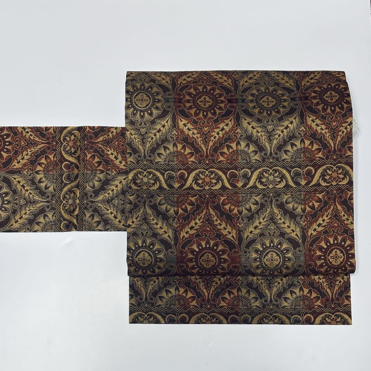 オリエンタル調のデザインをあしらった、落ち着いた色合いの名古屋帯です。