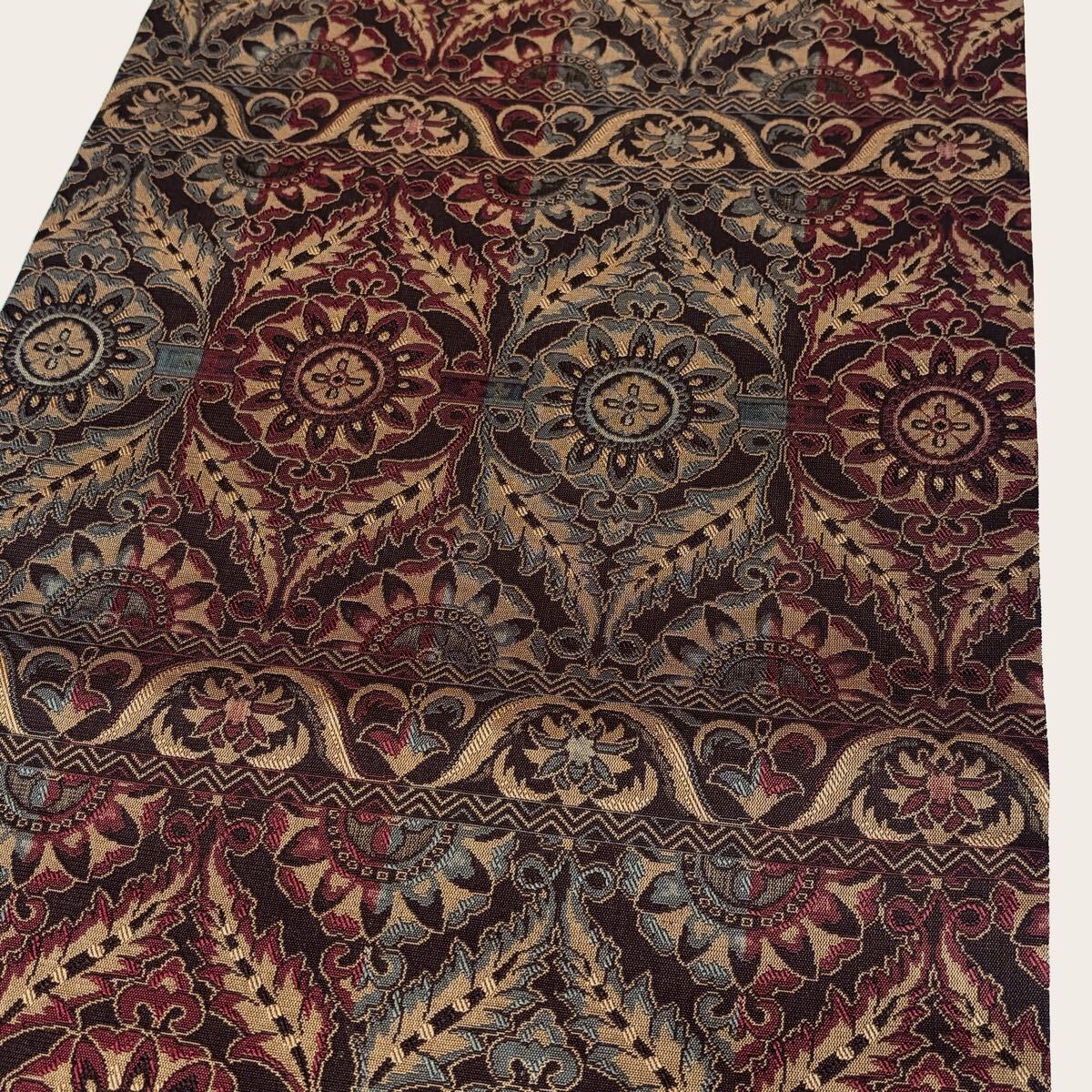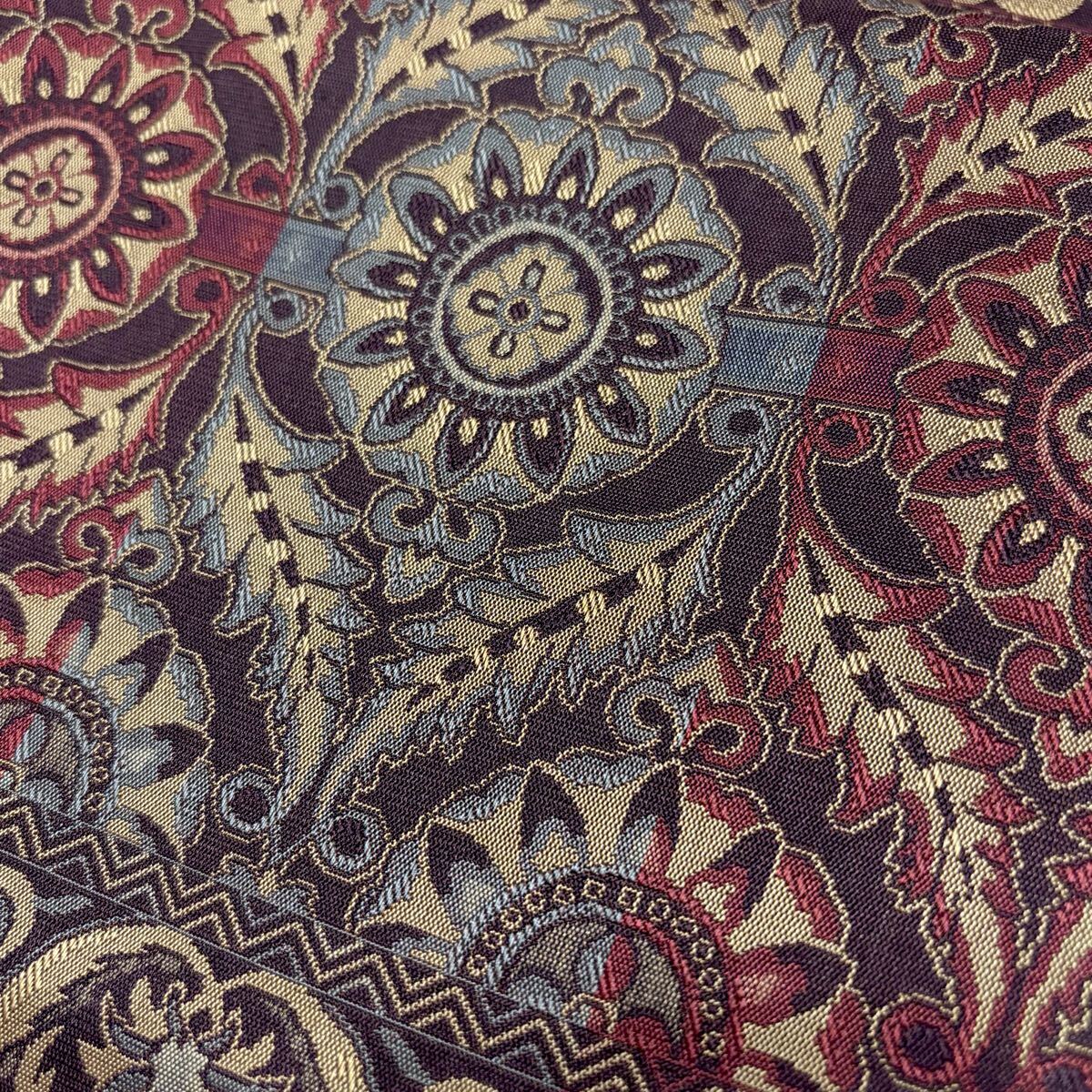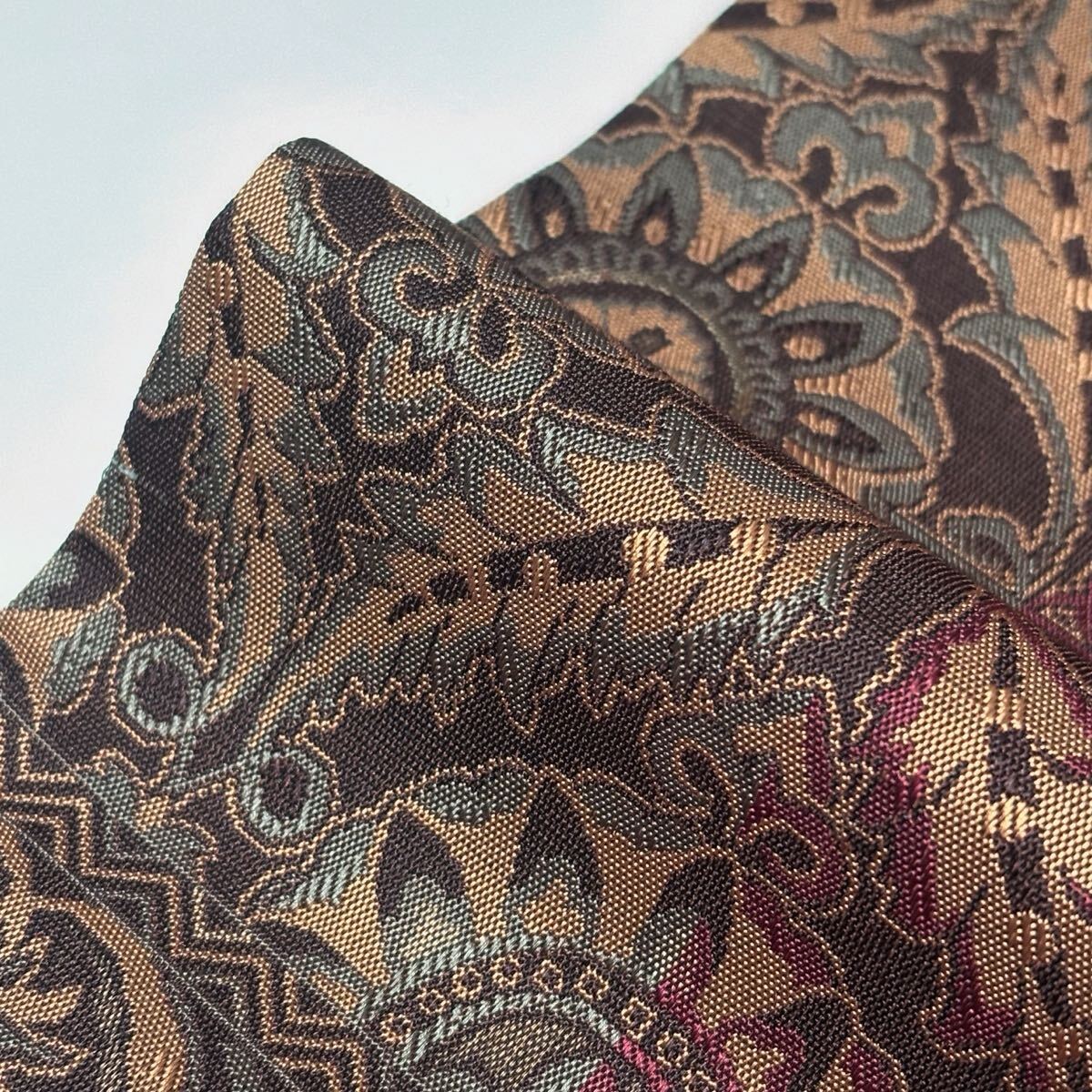 オリエンタル調のデザインをあしらった、落ち着いた色合いの名古屋帯です。