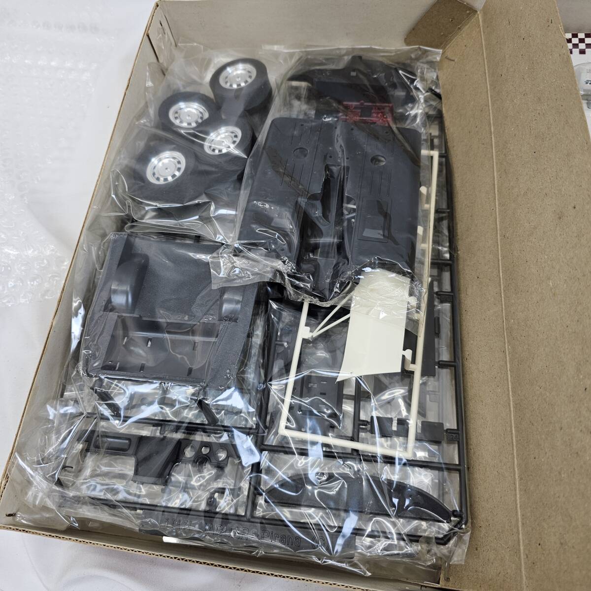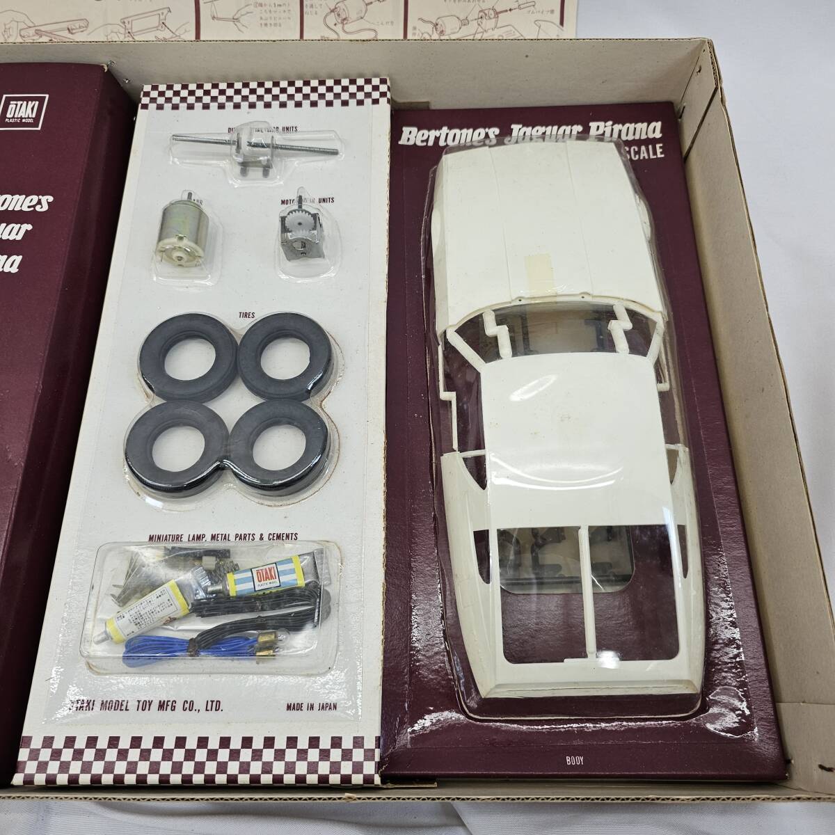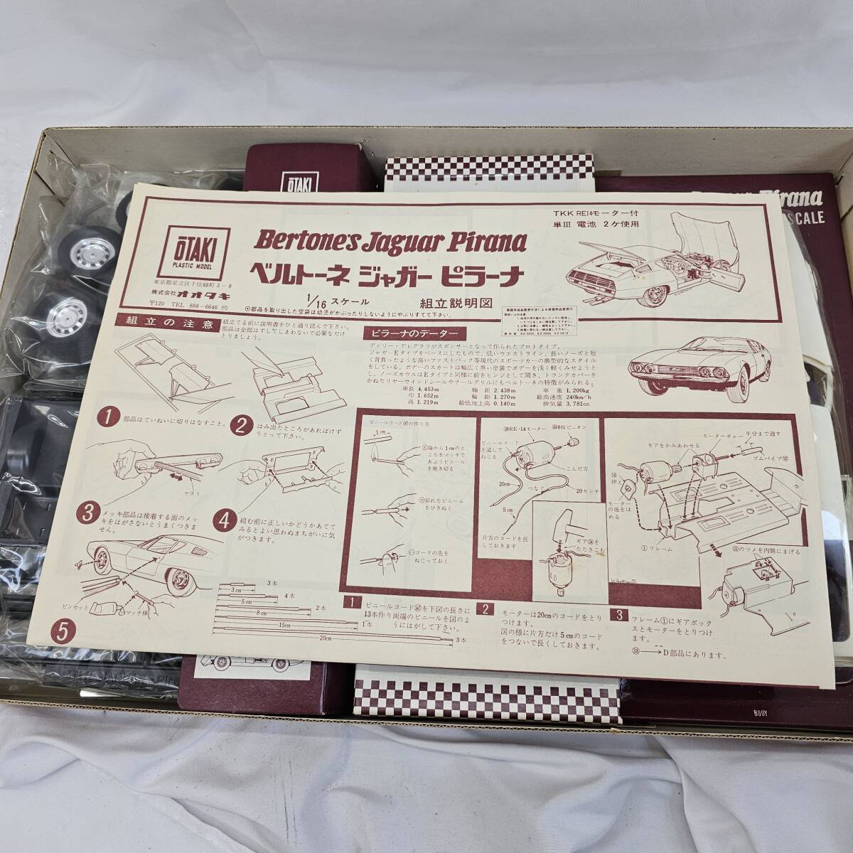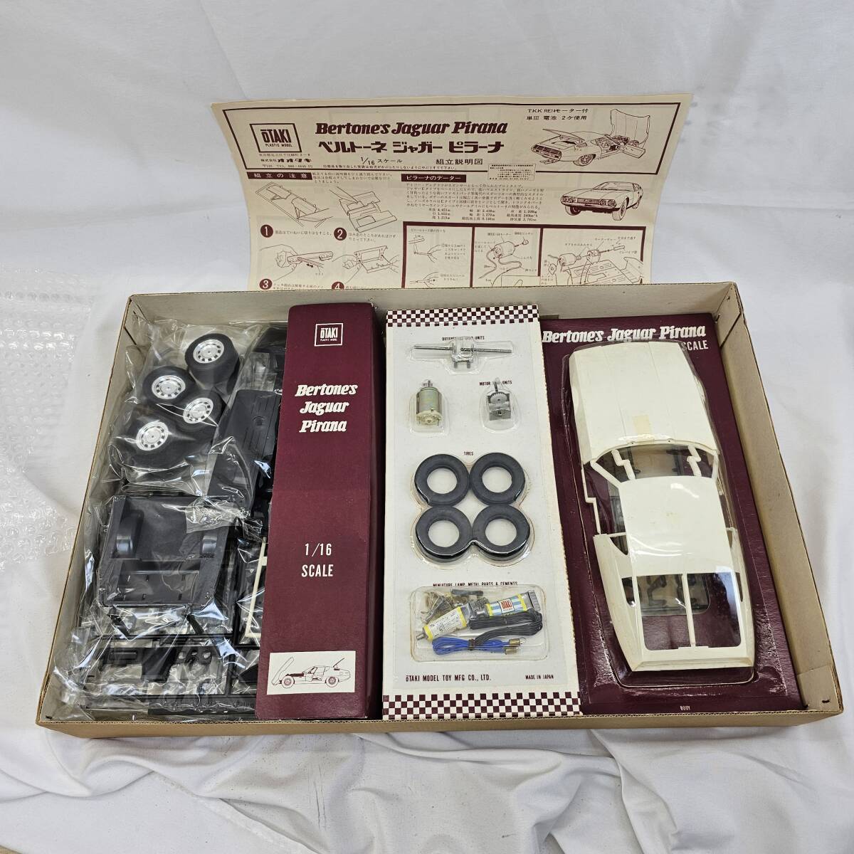 1/16スケールのBertone's Jaguar Pirana組み立てキット。 開封はされていますが欠品はなさそうです 画像に写っているもの以外の付属品はございません。 比較的きれいな商品ですが、レトロな商品の為経年劣化や汚れ、傷などはございます。 あらかじめご了承ください。 - モデル名: Bertone's Jaguar Pirana - スケール: 1/16 - キットタイプ: 組み立てキット - 付属品: タイヤ、パーツ、説明書 ご覧いただきありがとうございます。