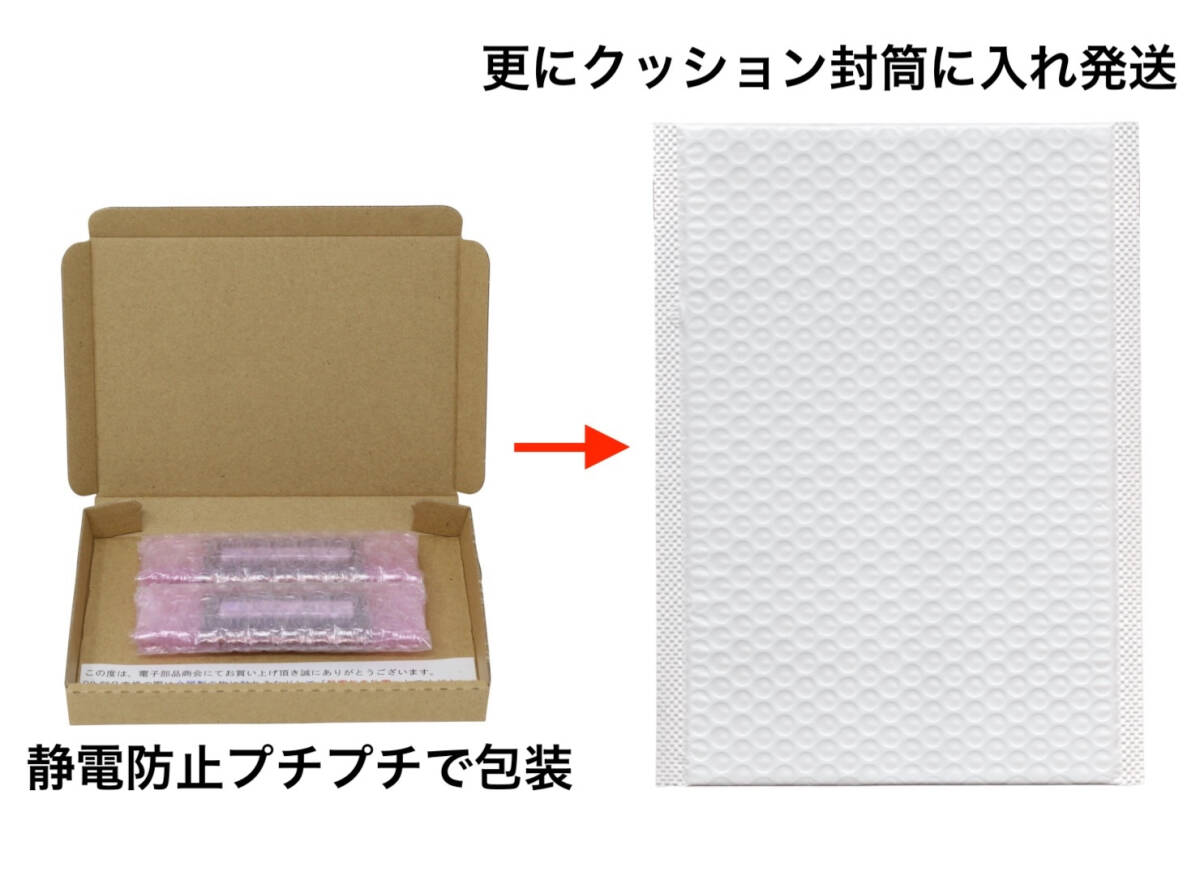 *メモリを静電防止エアキャップで包装した後、小箱内部に固定し、更にクッション封筒に入れ発送いたします。