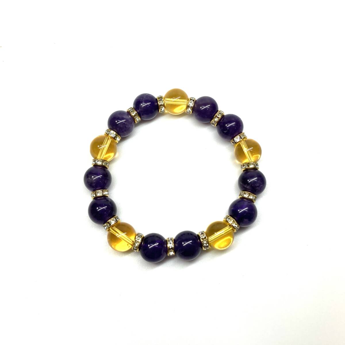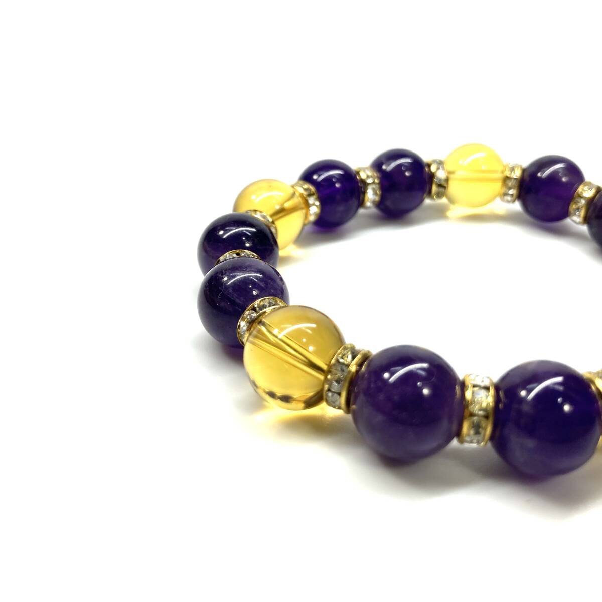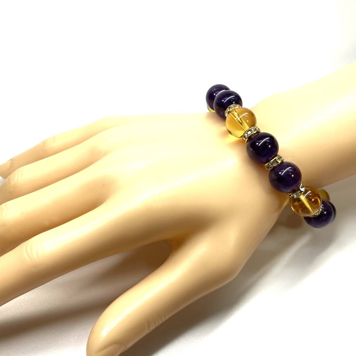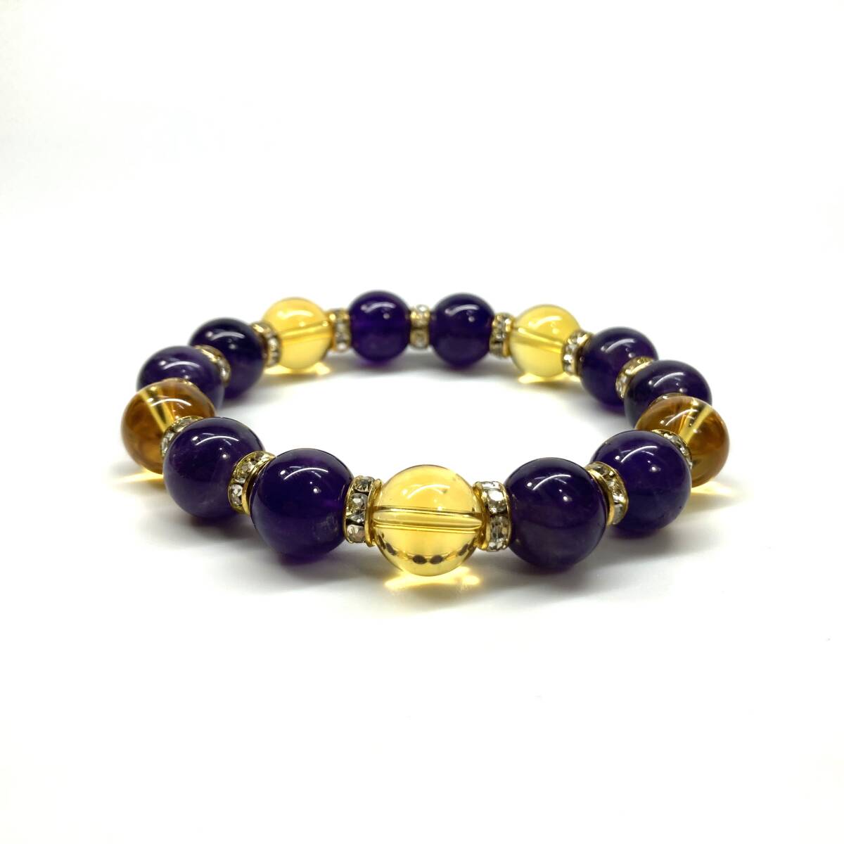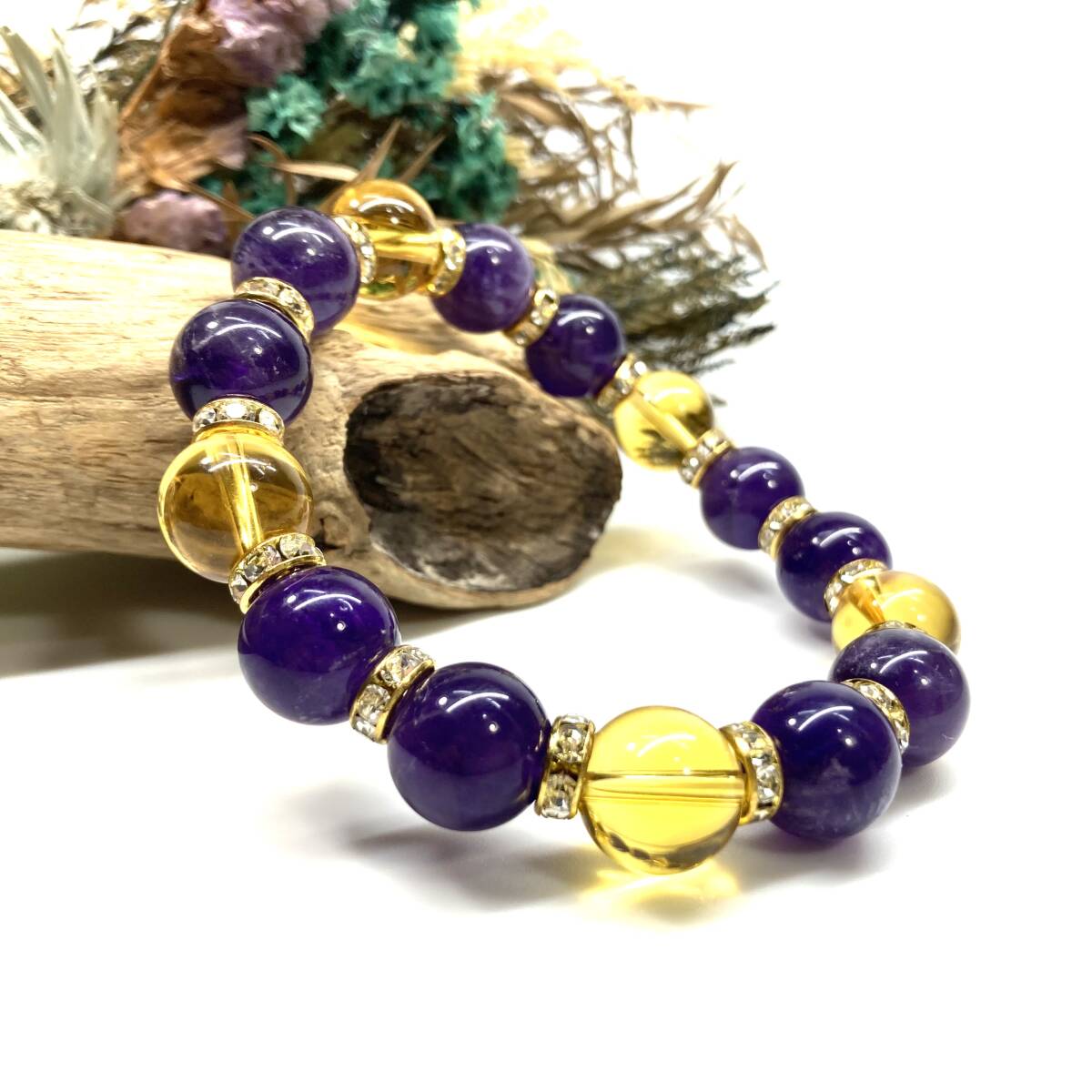 こちらは、シトリンとアメジストを組み合わせたパワーストーンブレスレットです。間にはロンデルを挟み高級感あるデザインに仕上げております。石大きさは12mm玉を使用して内周約18cmです。気になる方は是非この機会にどうぞ。