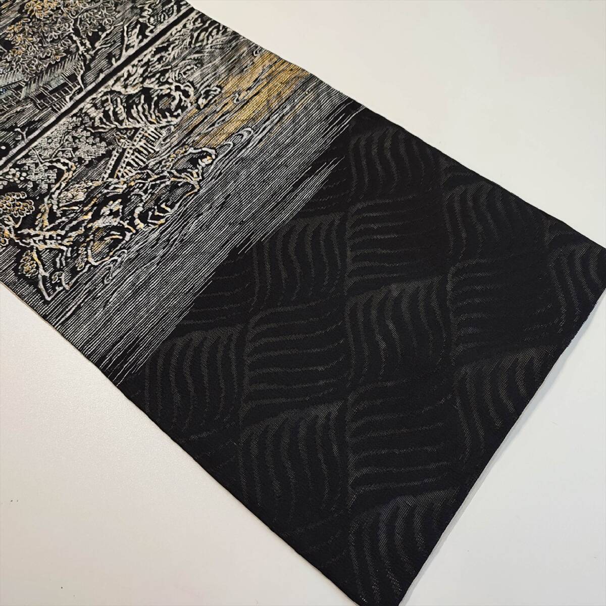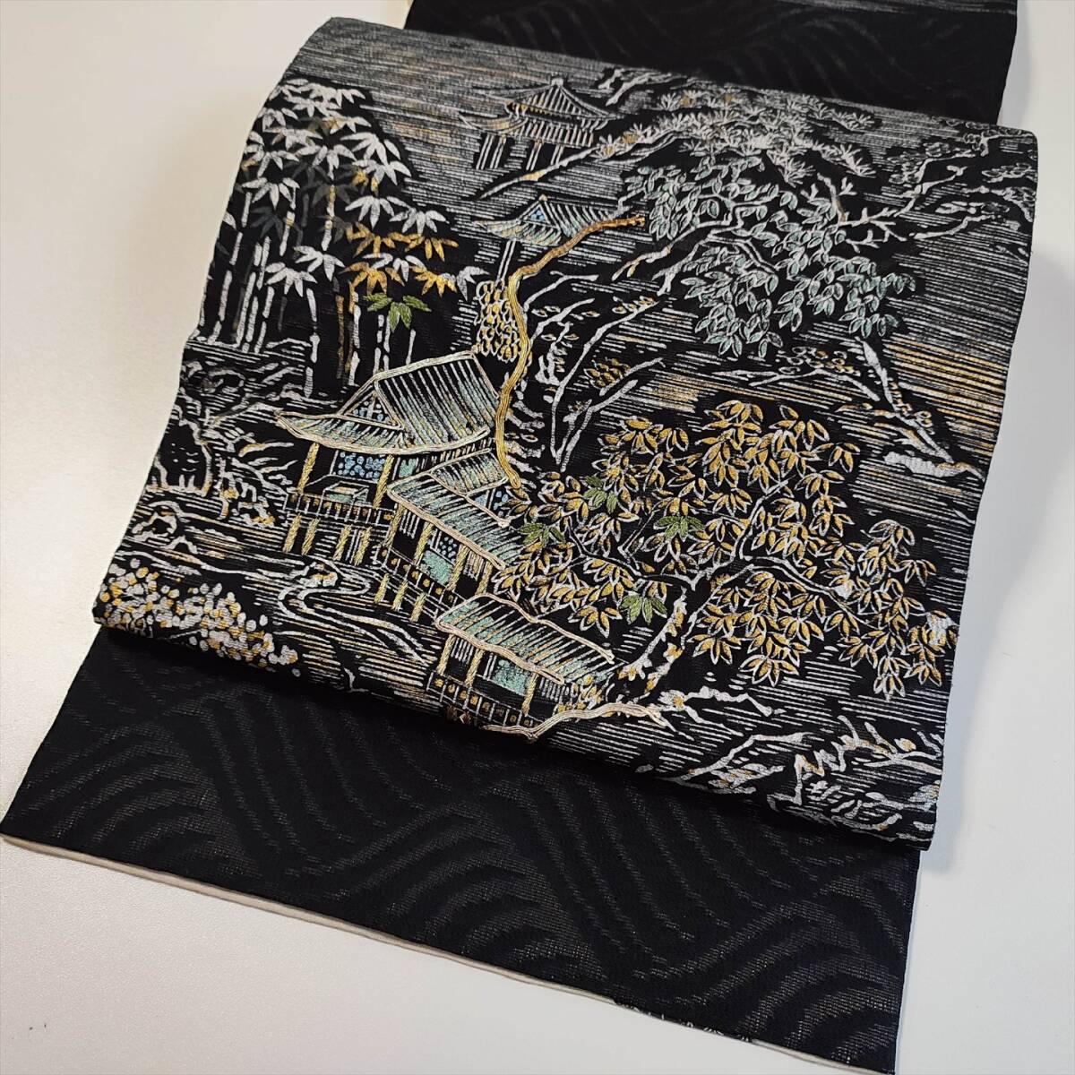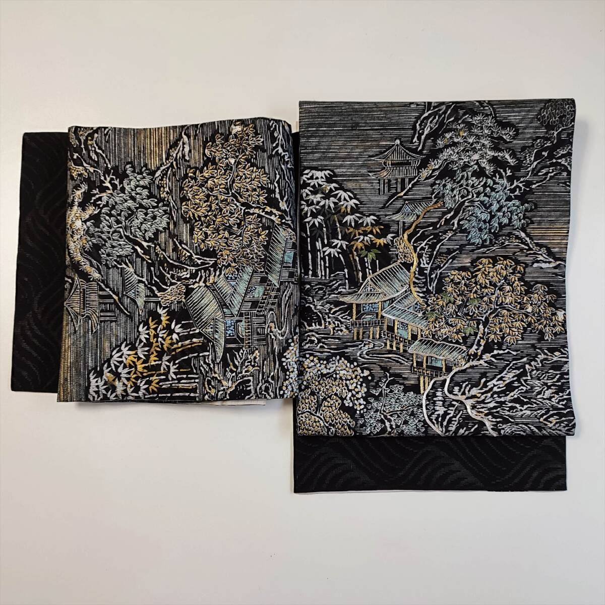 即決■着物の越田■幅31長さ402 正絹 アンティーク 袋帯 ハギレ・リメイク向け お太鼓柄 金糸有り 銀糸有り 黒地 風景文様 ■み19J06