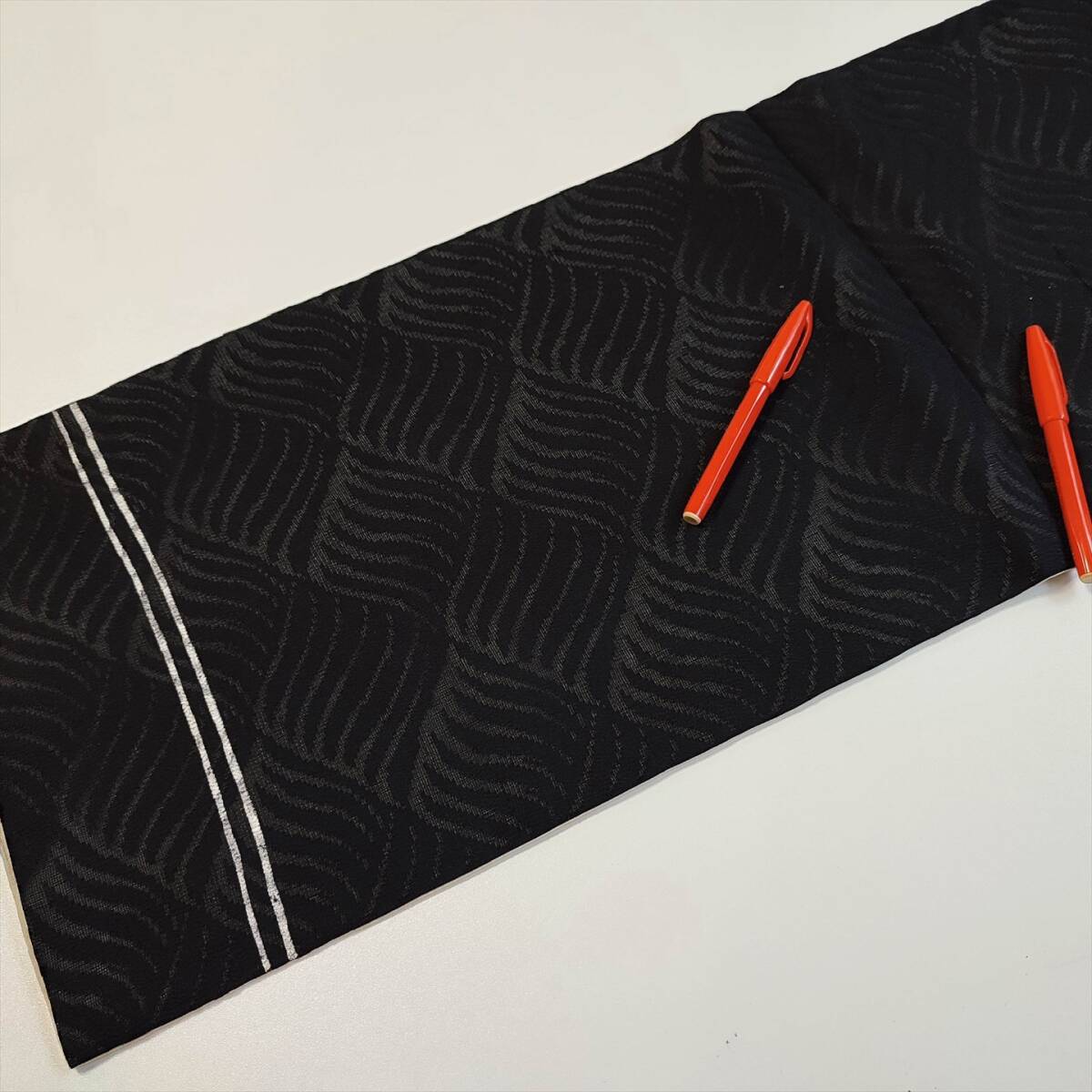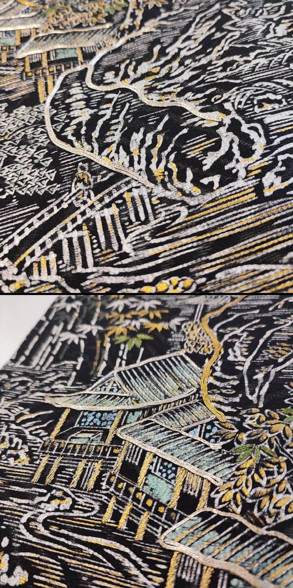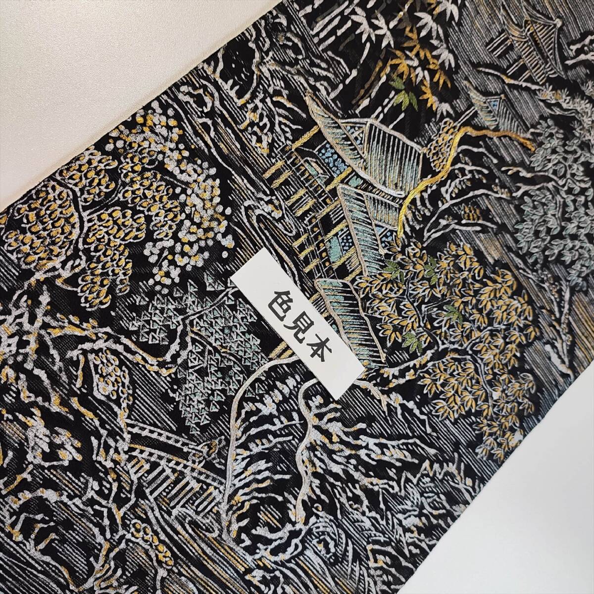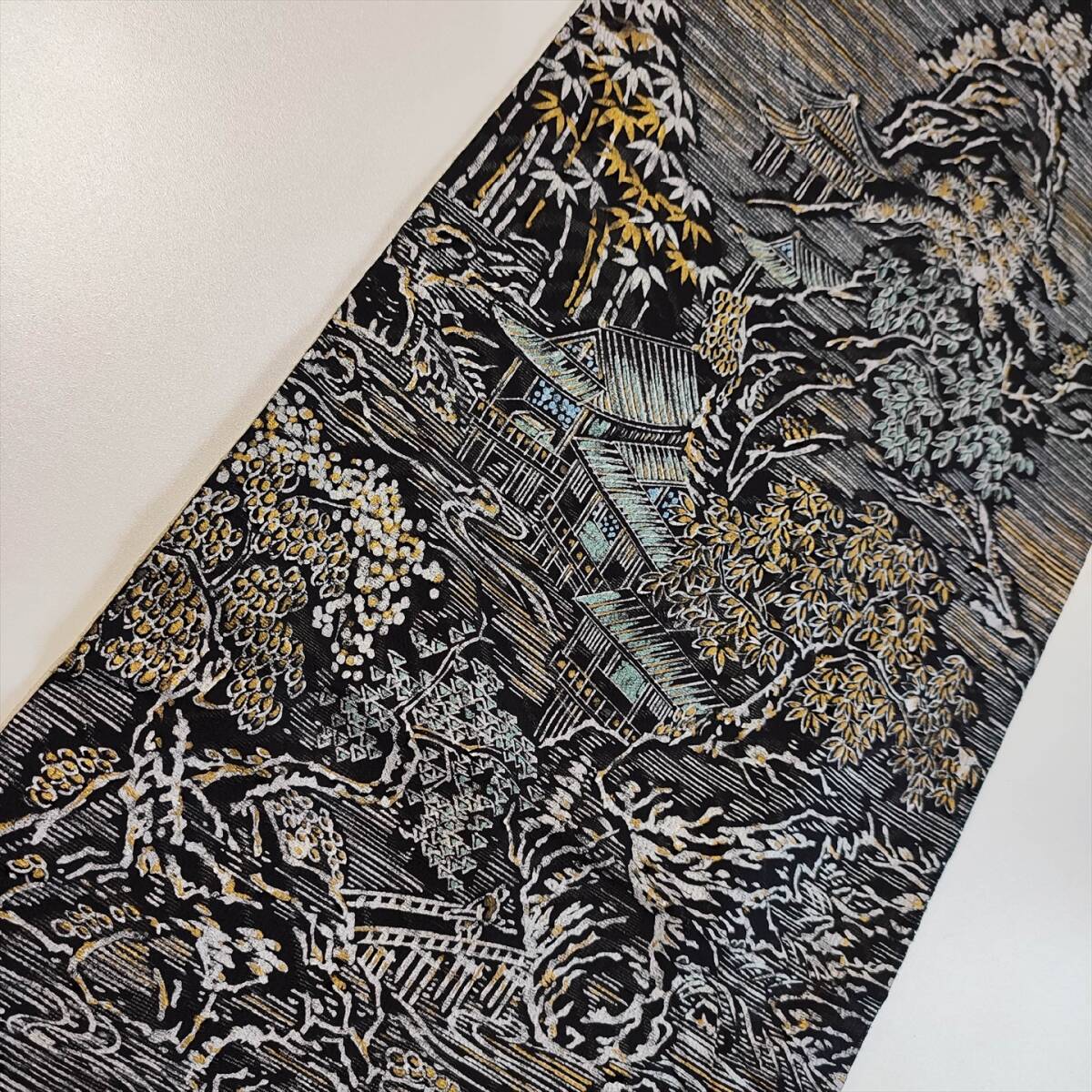 即決■着物の越田■幅31長さ402 正絹 アンティーク 袋帯 ハギレ・リメイク向け お太鼓柄 金糸有り 銀糸有り 黒地 風景文様 ■み19J06