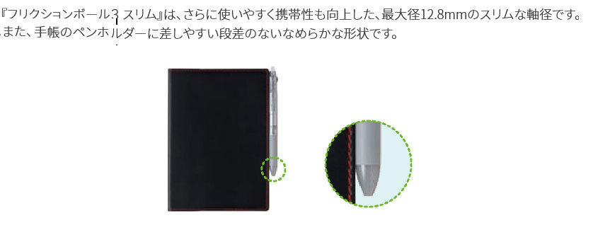 ・『フリクションボール3 スリム』は、さらに使いやすく携帯性も向上した、最大径12.8mmのスリムな軸径です。また、手帳のペンホルダーに差しやすい段差のないなめらかな形状です。