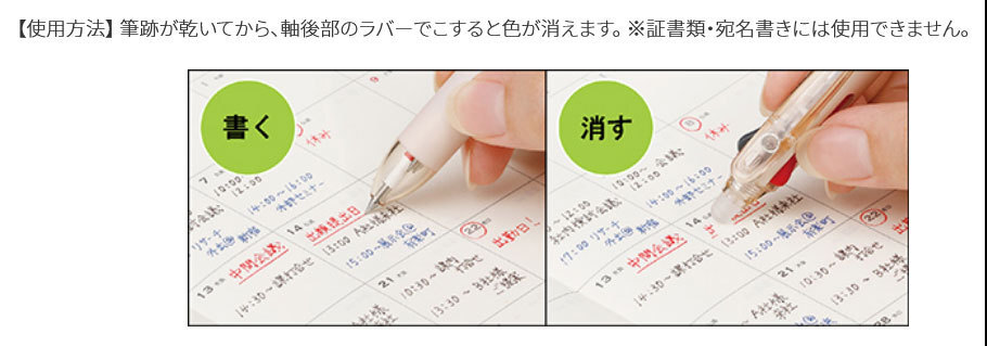 【使用方法】 筆跡が乾いてから、軸後部のラバーでこすると色が消えます。 ※証書類・宛名書きには使用できません。