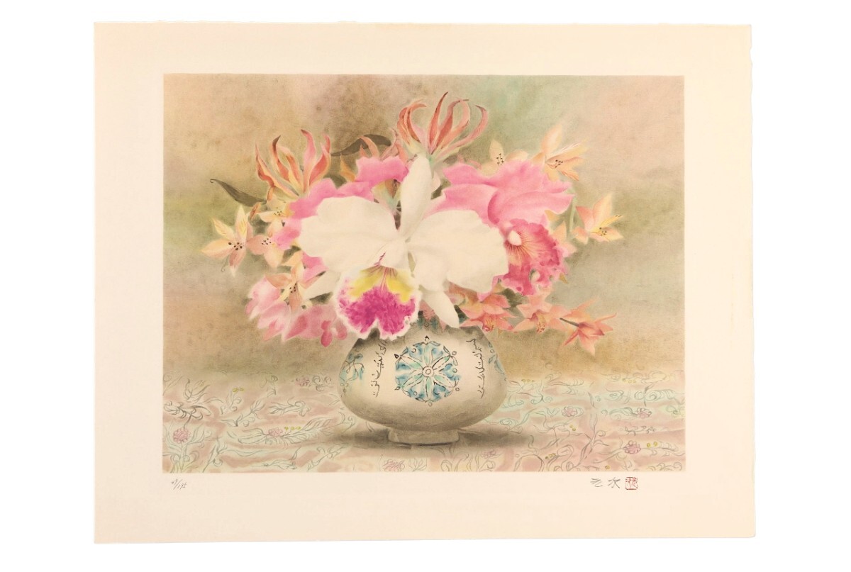 真作 堂本 元次 1994年リトグラフ「華やかな花々」画寸 49×37cm 京都府出身 日展参事 堂本印象の長兄 やわらかな線リズミカルな構成 11306