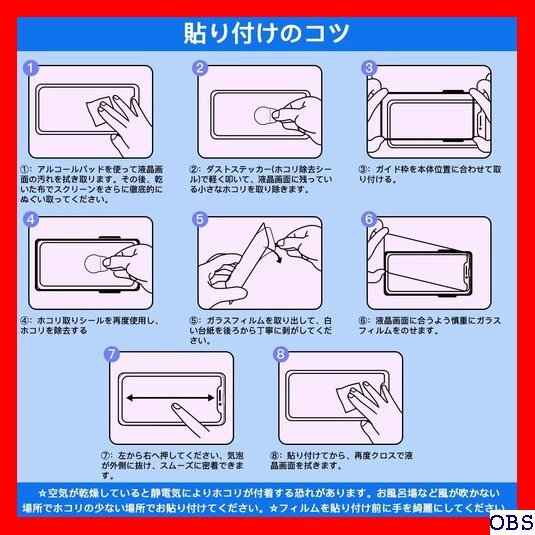 <ヒント>◆少量の気泡/接着剤が残る場合、クリーニングクロスを使って、その位置で繰り返して拭きながら画面を押して、取り除くことができます。◆広い範囲の気泡が残っている場合は、ガラスフィルムを軽く持ち上げて、気泡をガラスフィルムの外まで押し出してから、再吸着してください。