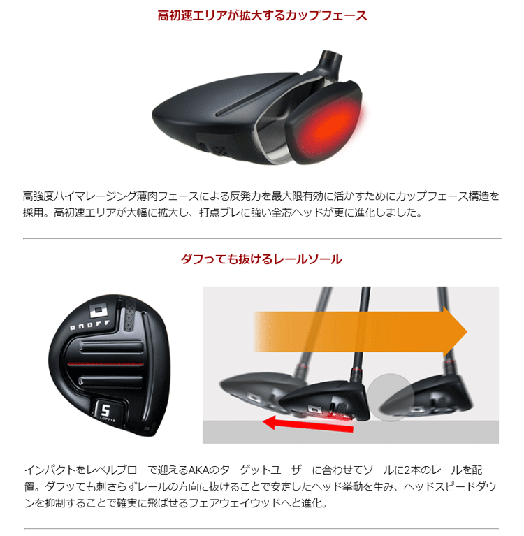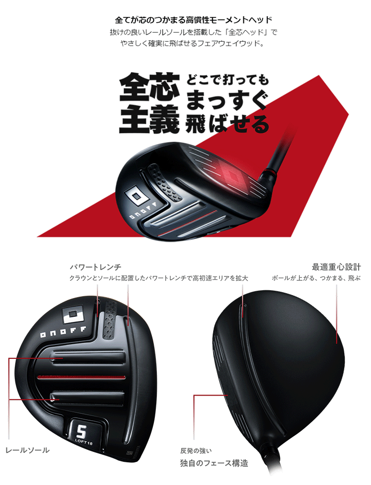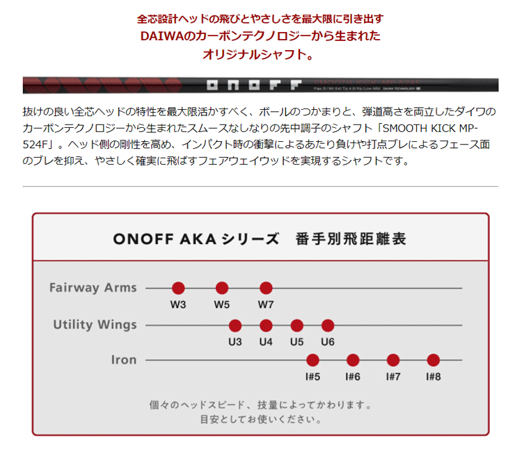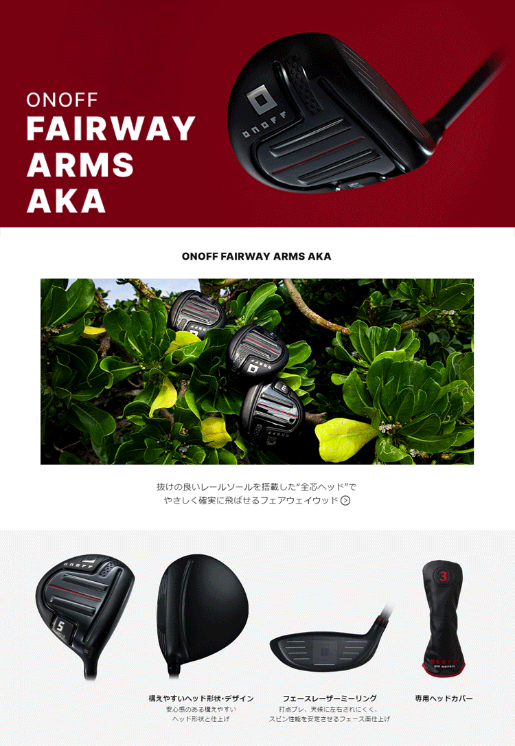 【商品特徴】 「オートマチックなやさしいクラブで飛ばす」をコンセプトに 「飛び」「やさしさ」「デザイン」に徹底的にこだわり、 ゴルフを楽しむために開発されたクラブ性能とシンプルで上質なデザイン。 オノフAKAは、オートマチックなやさしいクラブで、 自由自在に飛ばしたい大人のゴルファーに最適なシリーズです。 抜けの良いレールソールを搭載した「全芯ヘッド」で やさしく確実に飛ばせるフェアウェイウッド。 ONOFF FAIRWAY ARMS AKA 標準シャフト ヘッド:ハイマレージングCH-1カップフェース+ハイマレージング450ボディ 番手:3W シャフト:SMOOTH KICK MP-524F シャフトフレックス:Rフレックス グリップ:ONOFF PCラバー360(45g) バックラインなし 価格:46,200 円(税込) ・ヘッドカバー付き ・SLEルール適合 クラブ: made in Japan ヘッドカバー: made in China ※撮影時の光量の具合や、ご覧いただいております画面環境によりまして、実際の商品と若干色味が違う場合がございます。 ※商品詳細のスペック値はメーカー表記の数値となりますが、個体差による若干の公差がございます。 ※TOP画像は5Wの商品画像となりますが、本商品は商品詳細記載の番手・ロフトとなります。