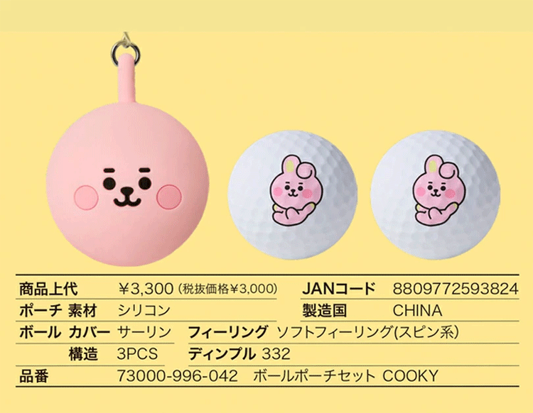 【商品特徴】 <BT21ゴルフアイテム日本初上陸!> ゴルフボールを1個収納できます。バッグにぶら下げるカラビナ付き。 【商品詳細】 ●状態:新品・未使用品 ●セット内容:ボールポーチ×1個、ゴルフボール×2個 ●ボール素材:ポリブタジエン(コア)・サーリン(カバー) ●素材:本体/シリコン 金属部分/スチール ●サイズ:本体/43×50×43 カラビナ/15×60×5(mm) ●重量:本体/16g 金属部分/6g ※撮影時の光量の具合や、ご覧いただいております画面環境によりまして、実際の商品と若干色味が違う場合がございます。 ※商品詳細のスペック値はメーカー表記の数値となりますが、個体差による若干の公差がございます。