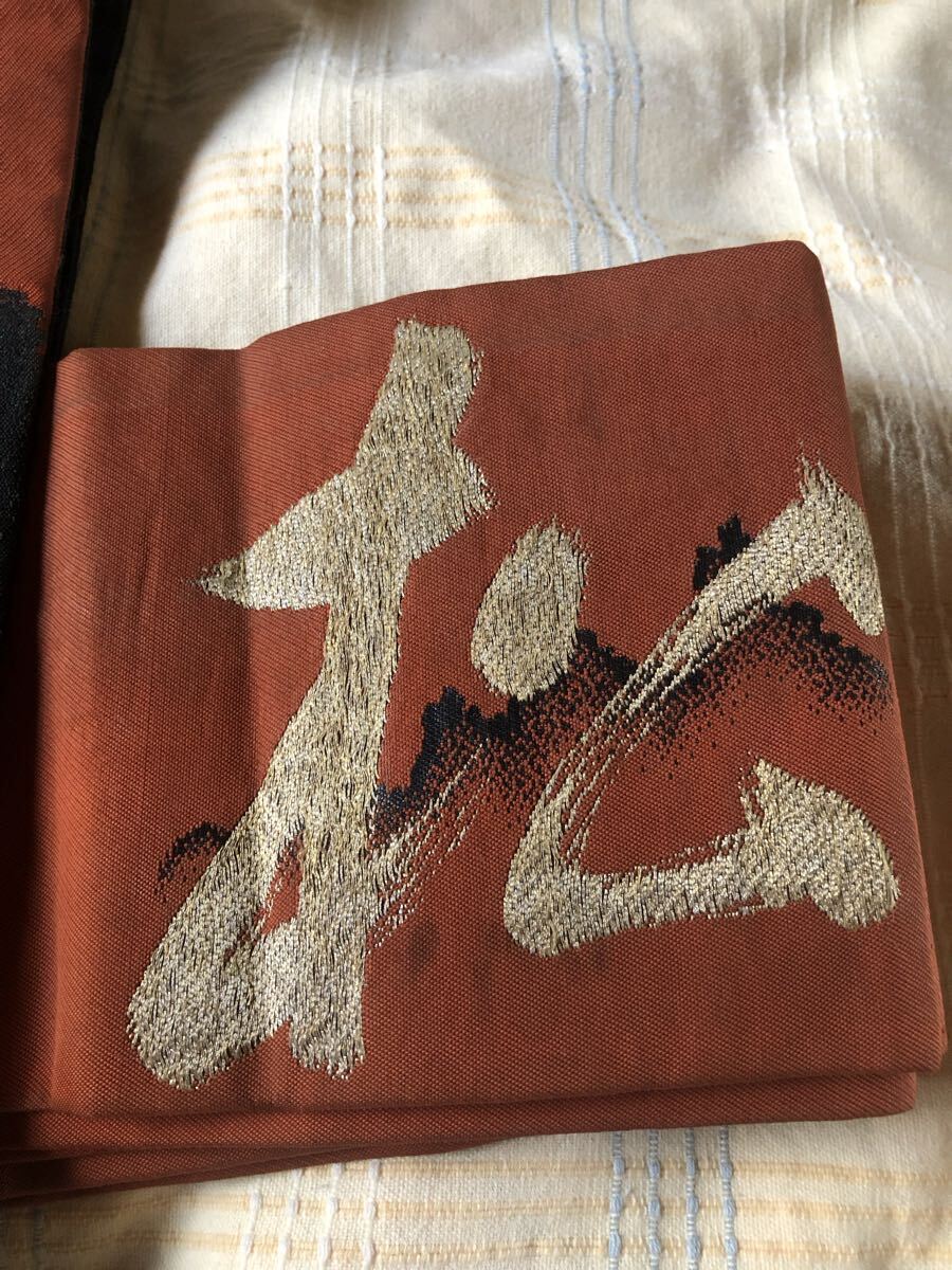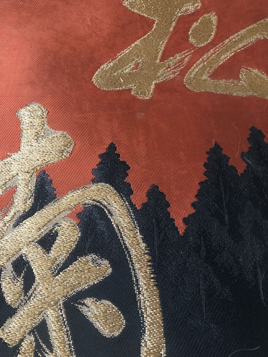 朱色と黒地を基調にした「松」「菊」の文字を金糸で刺繍した名古屋帯です。