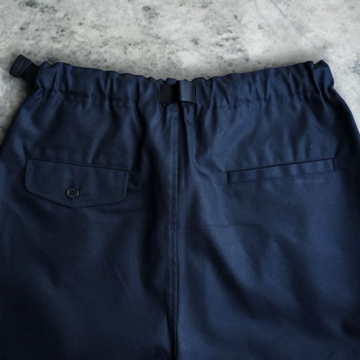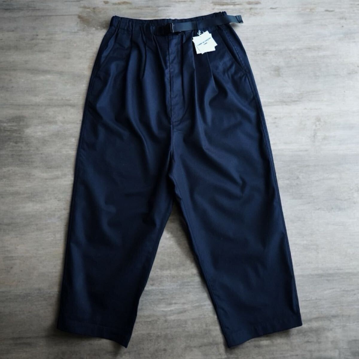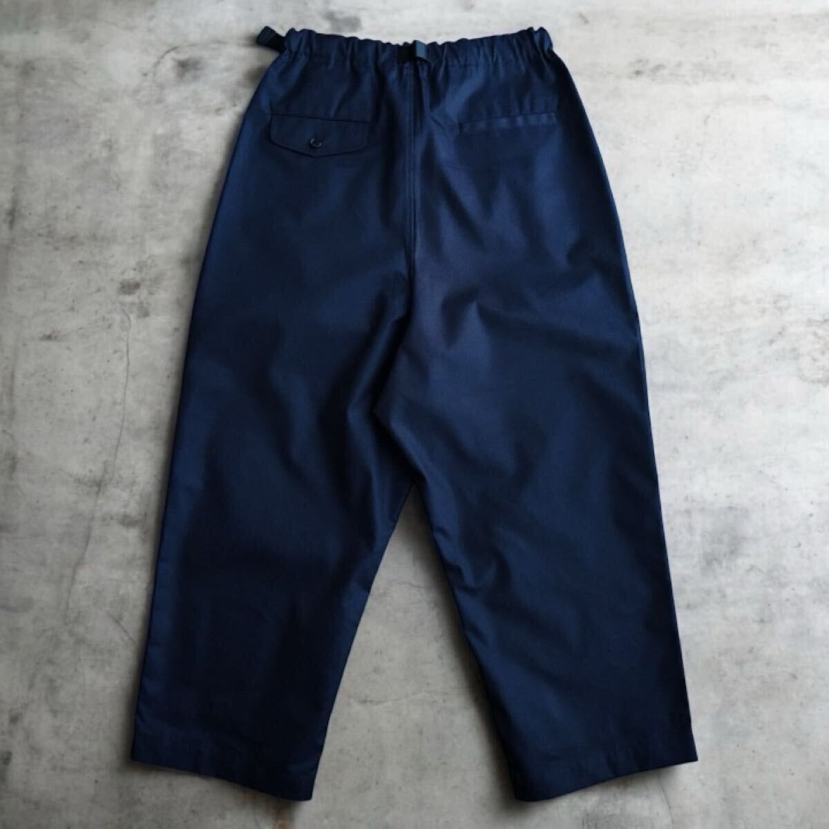 程よくハリのある綿ポリエステルギャバ素材を使用した、ワイドテーパードシルエットの一本。