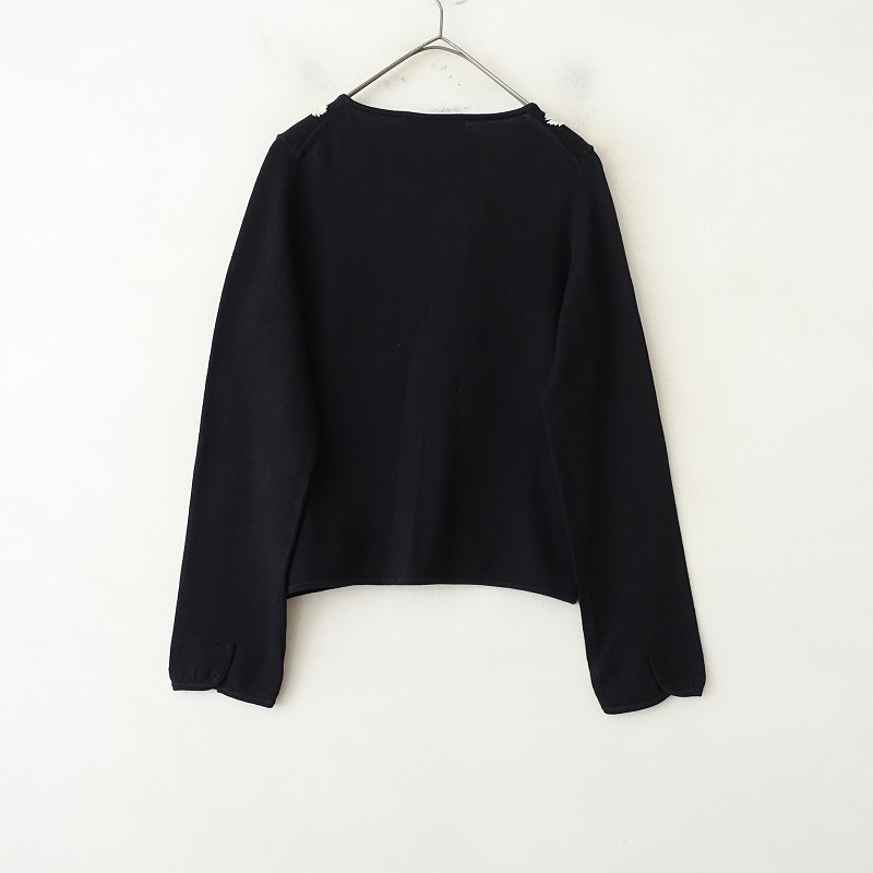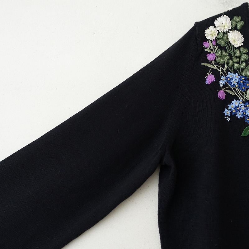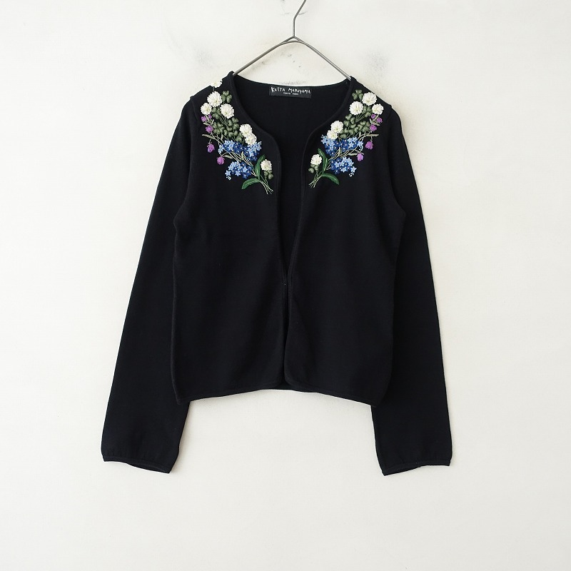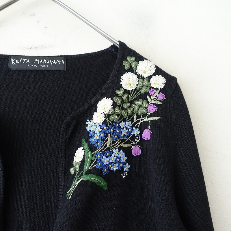 | KEITA MARUYAMAのフラワー刺しゅうカーディガンです。カラーはブラックです。糸やリボンテープ・ビーズを使った華やかなフラワー刺しゅうがあしらわれております。ふっくらとした薄手のコットンニットで仕立てられています。フロントは1フック留めです。袖口はスリット入り。ポケットはございません。 |