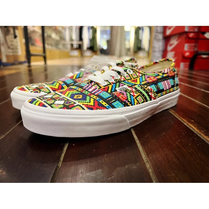 カラフルで独特な幾何学模様が目を引く一足!足元のアクセントにぴったりで、ストリートやカジュアルコーデに相性抜群です。