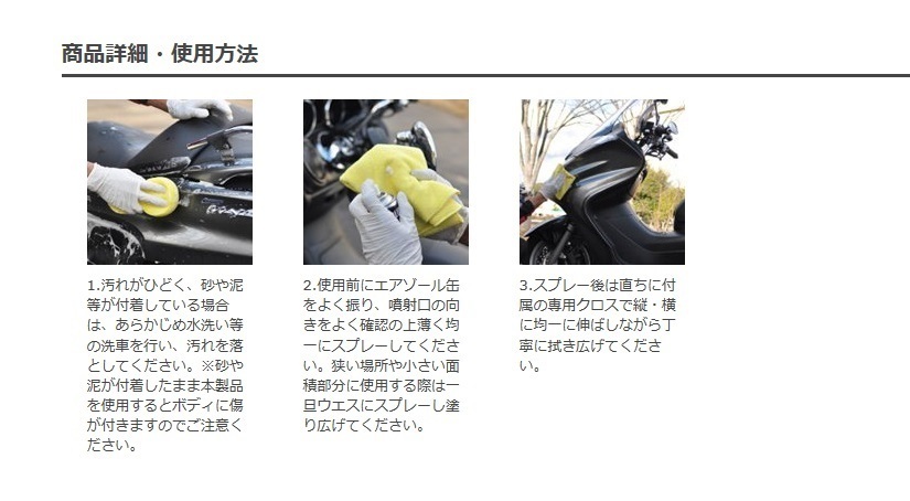 ![]() | スプレー(泡タイプ)して塗り伸ばしふき取るだけで簡単コーティング。(ガラス系撥水尾皮膜) |