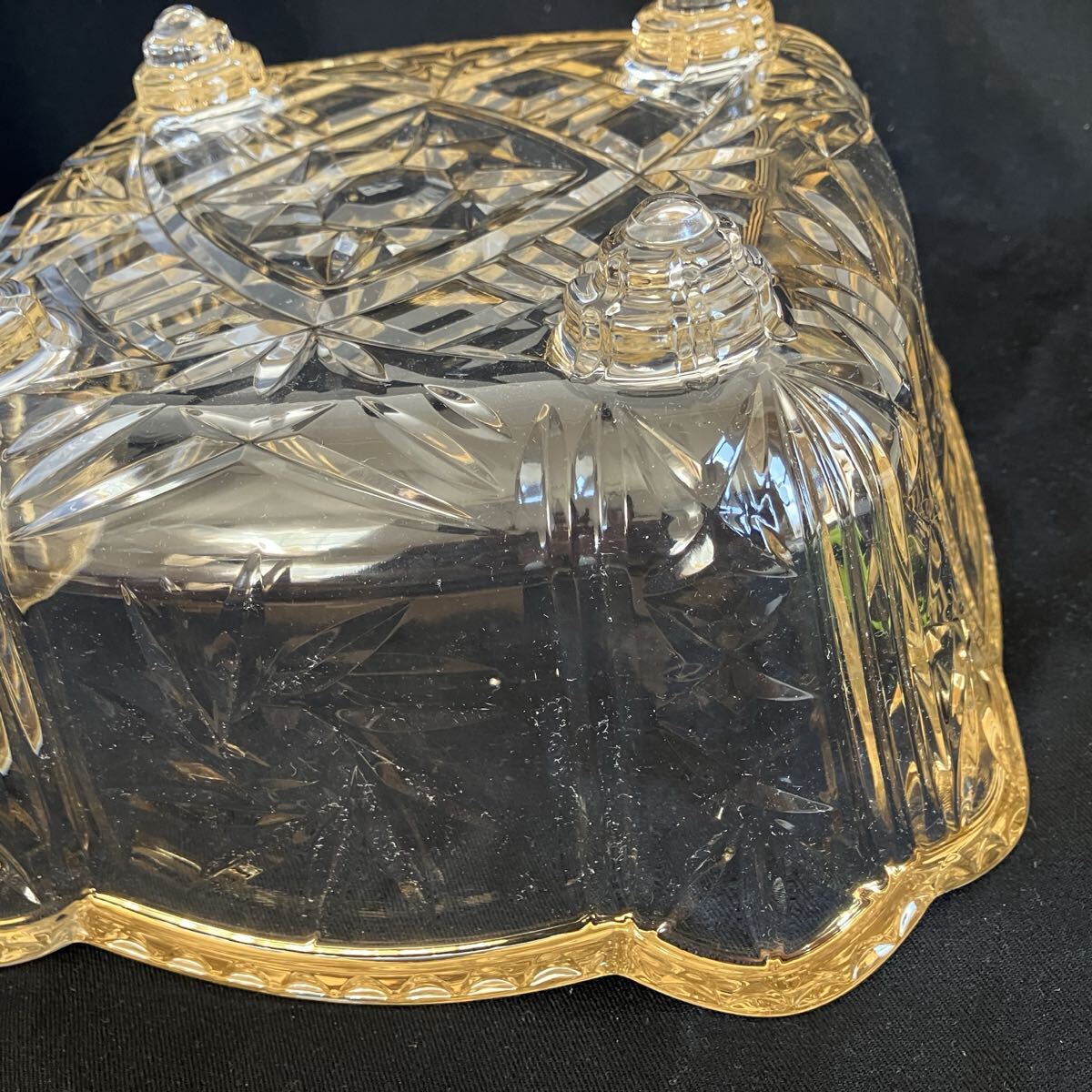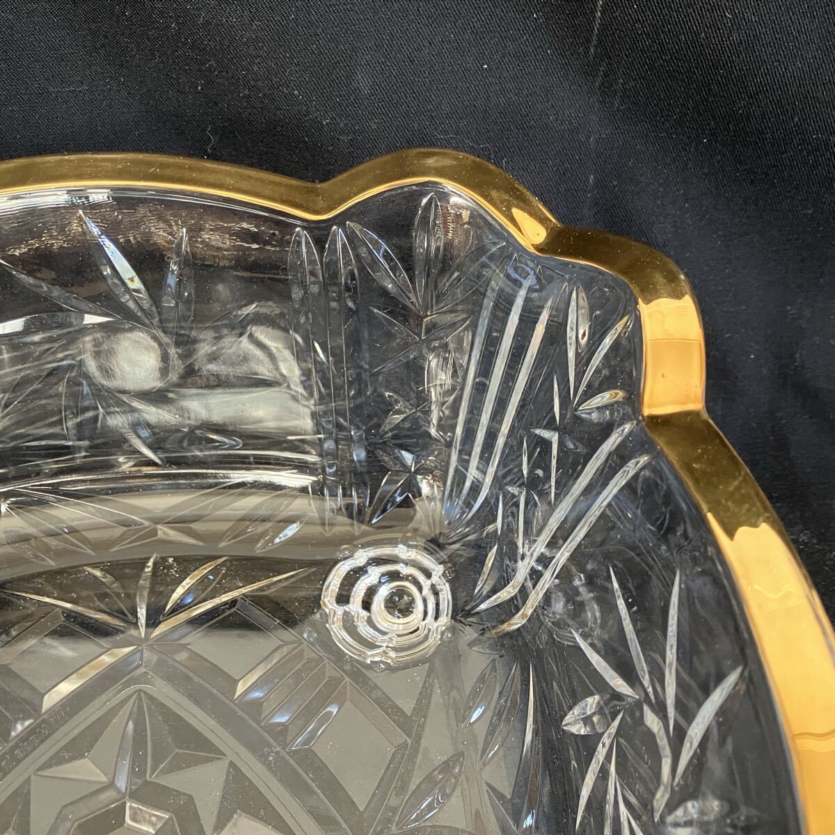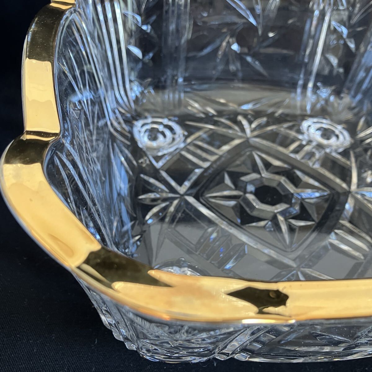 厚みのあるガラスの、カット模様と金色の縁取りが美しい食器です。