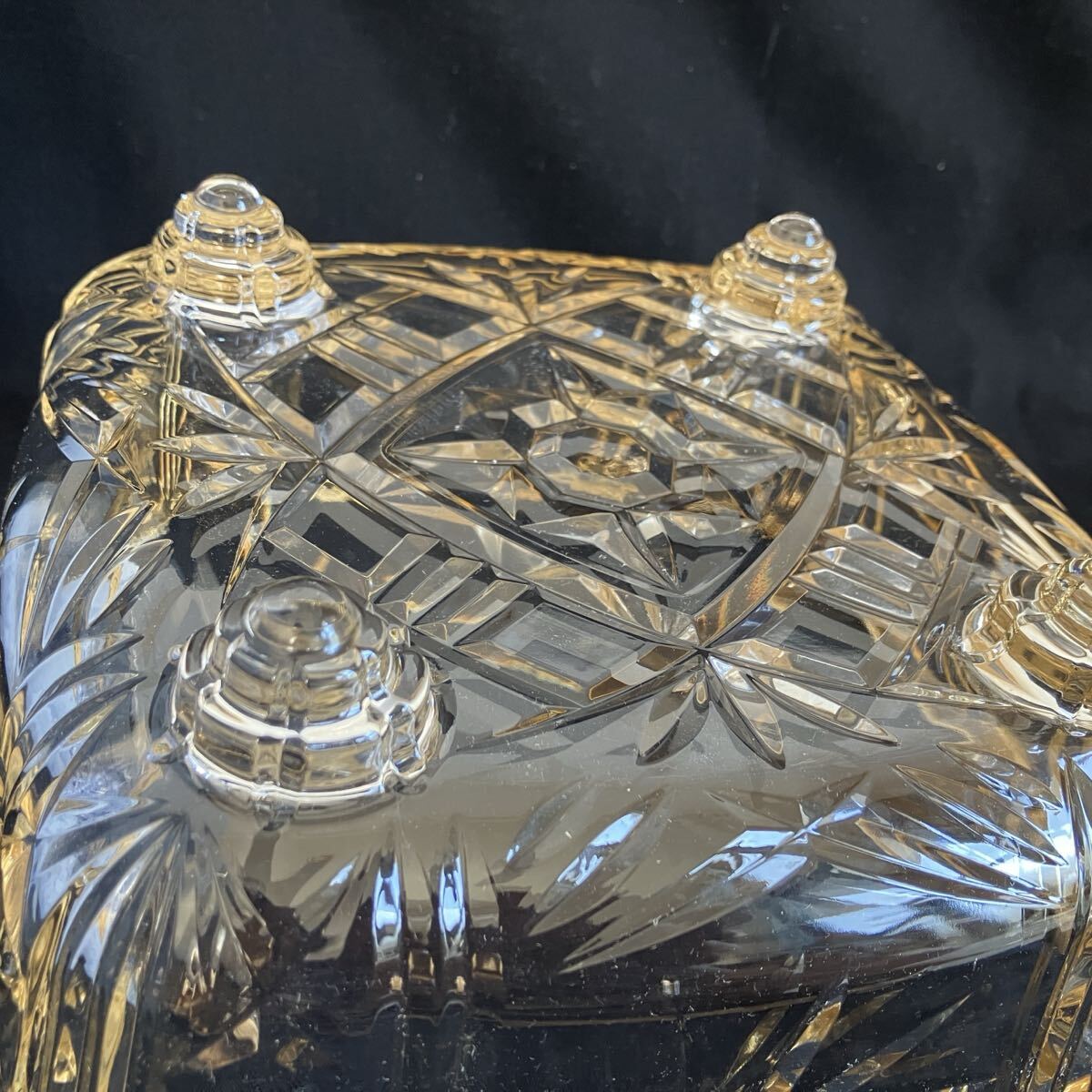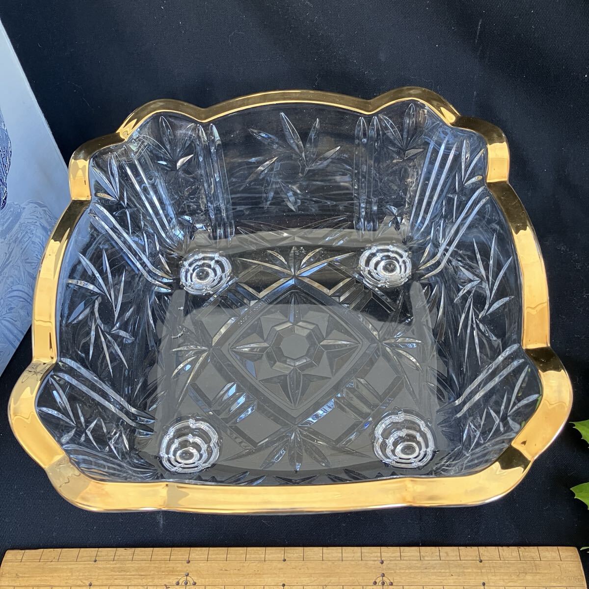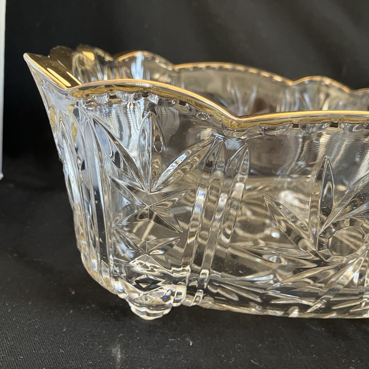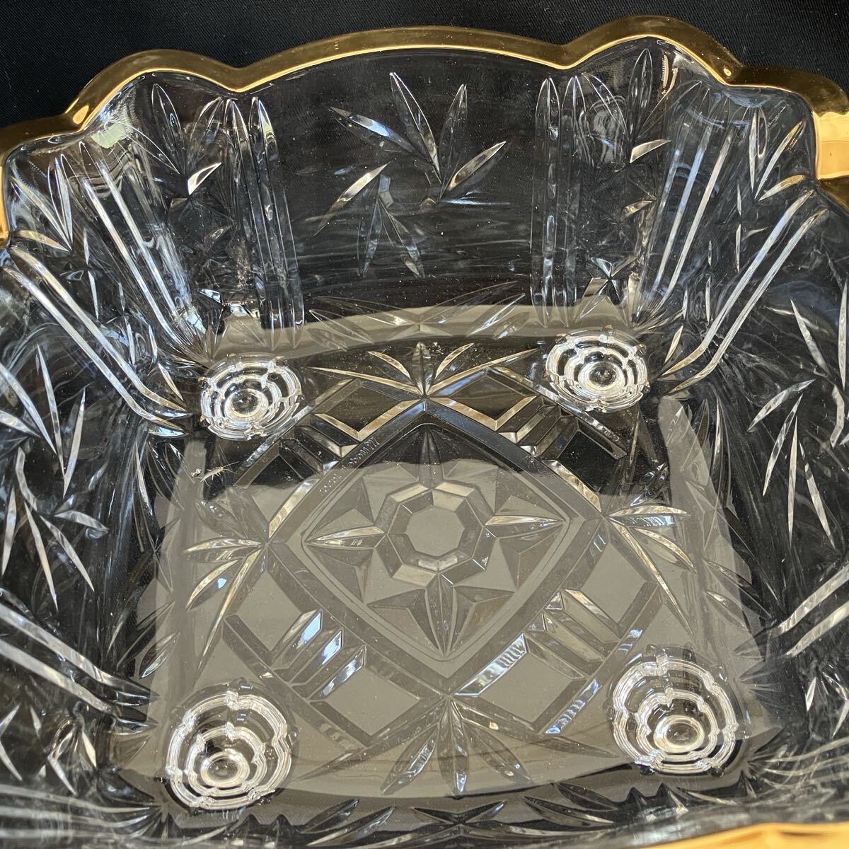 厚みのあるガラスの、カット模様と金色の縁取りが美しい食器です。