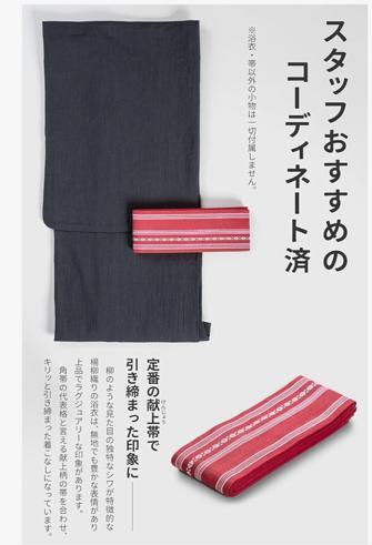 品のあるマットな質感と独特な縦シボが特徴的な綿麻楊柳浴衣と王道で人気の高い綿献上帯の2点セットです。スタッフのおすすめコーディネート済みなので迷う必要なく誰でもお洒落に着こなせます。
