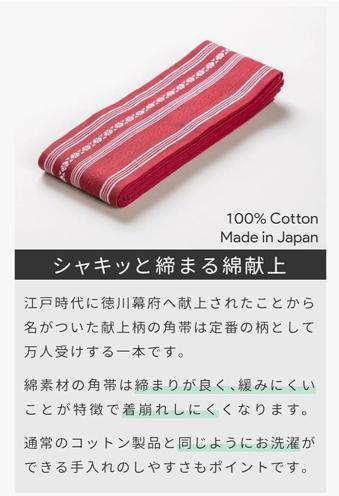 シャキッと締まる綿献上 江戸時代に徳川幕府へ献上されたことから名がついた献上柄の角帯は定番の柄として万人受けする一本です。綿素材の角帯は締まりが良く、緩みにくいことが特徴で着崩れしにくくなります。通常のコットン製品と同じようにお洗濯ができる手入れのしやすさもポイントです。