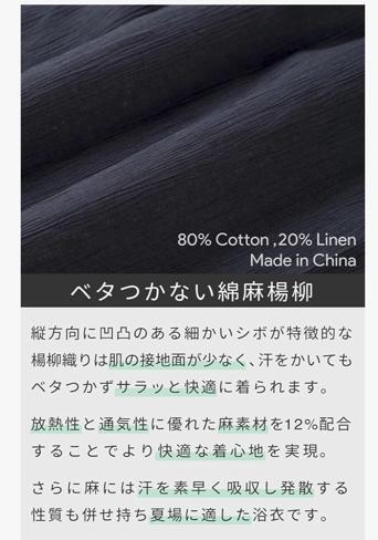 ベタつかない綿麻楊柳ゆかた 縦方向に凹凸のある細かいシボが特徴的な楊柳織りは肌の接地面が少なく、汗をかいてもベタつかずサラッと快適に着られます。放熱性と通気性に優れた麻素材を12%配合することでより快適な着心地を実現。さらに麻には汗を素早く吸収し発散する性質も併せ持ち夏場に適した浴衣です。