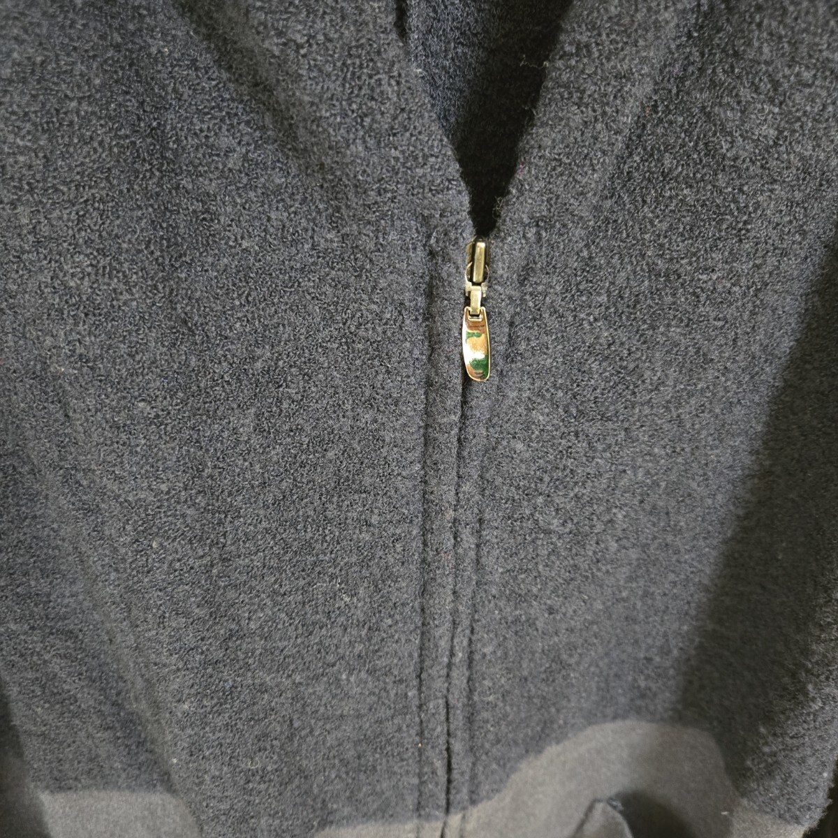 フード付きのダークブルーのフリースジャンパー、柔らかい素材でカジュアルなスタイルに最適。