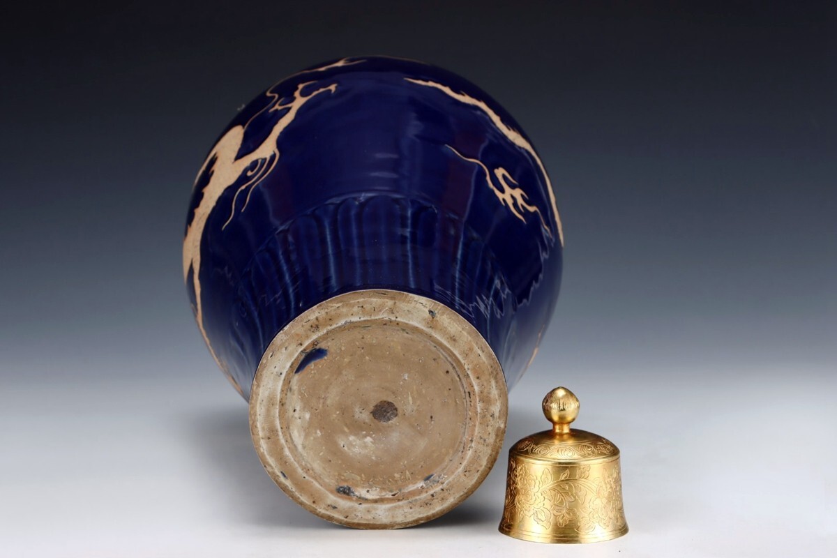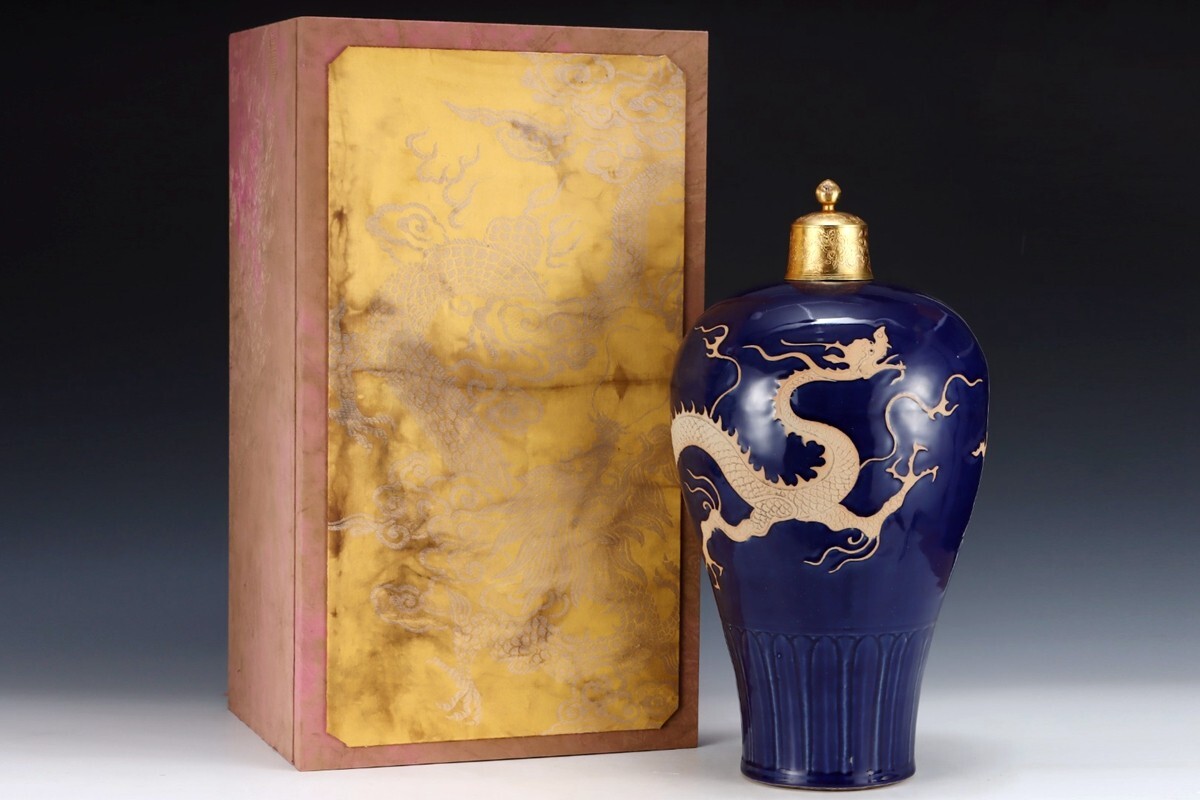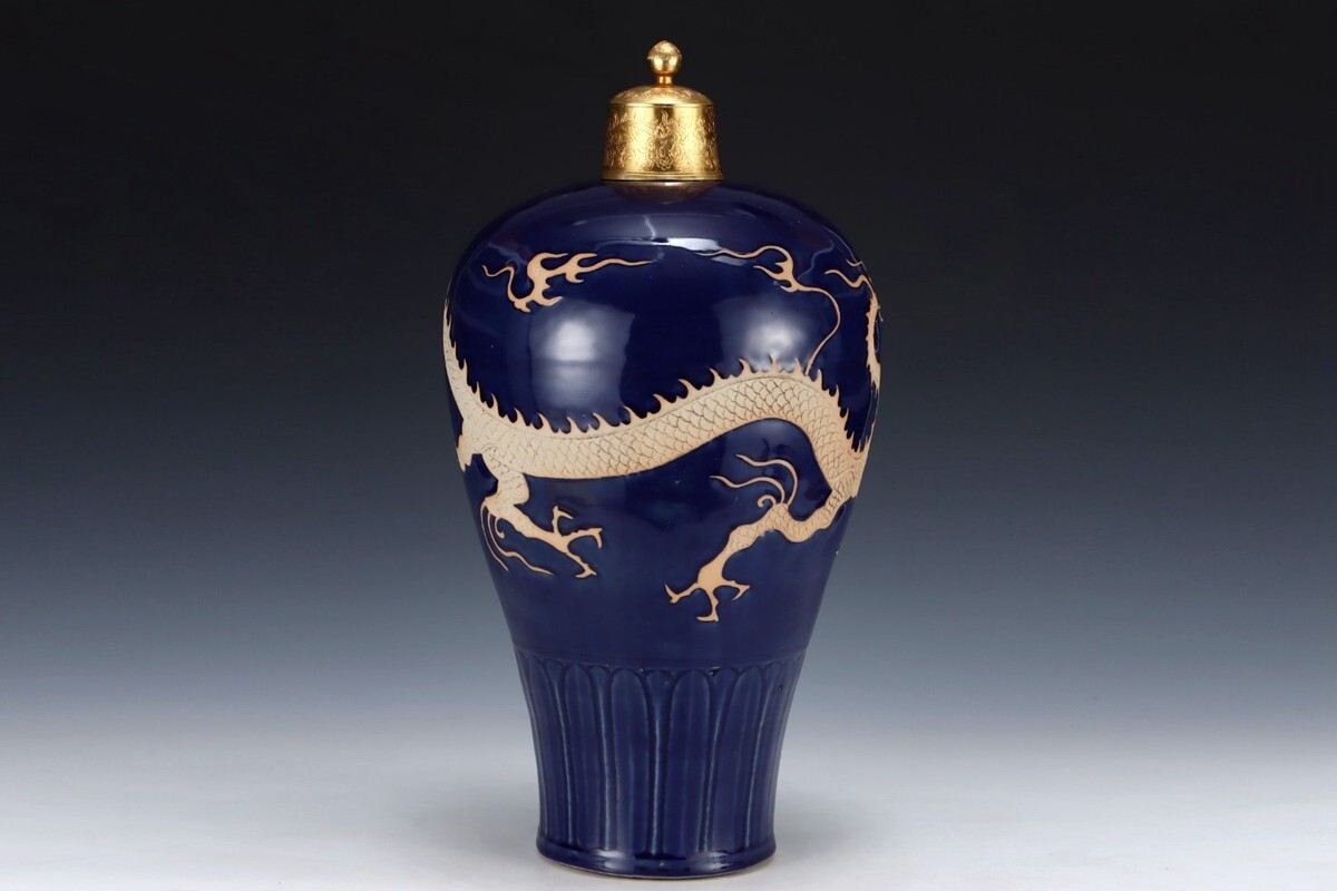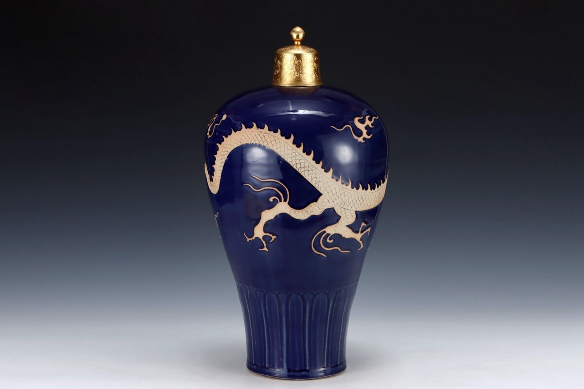 元代 陶磁器 祭藍釉龍紋 梅瓶【仁】染付 置物擺件 古賞物 古美術 中国古玩 蔵出